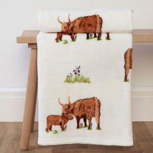 Highland Cow Family Natural Printed Fleece Throw (130cm x 150cm)