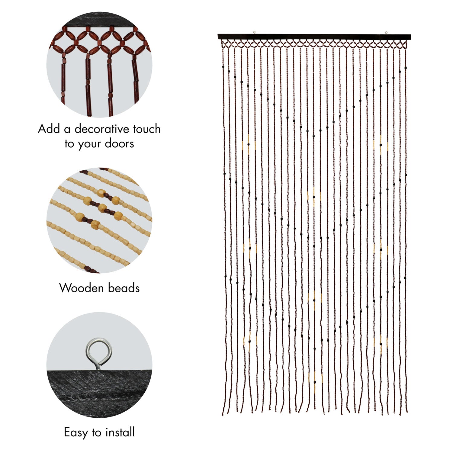 Our Tuscany beaded door curtains have a wonderful wooden bead/tube design. As well as adding a decorative touch, they are also a practical choice for any room, as they allow fresh air and sunlight to circulate whilst still providing a degree of privacy, whilst keeping those unwanted bugs out during the summer months.
