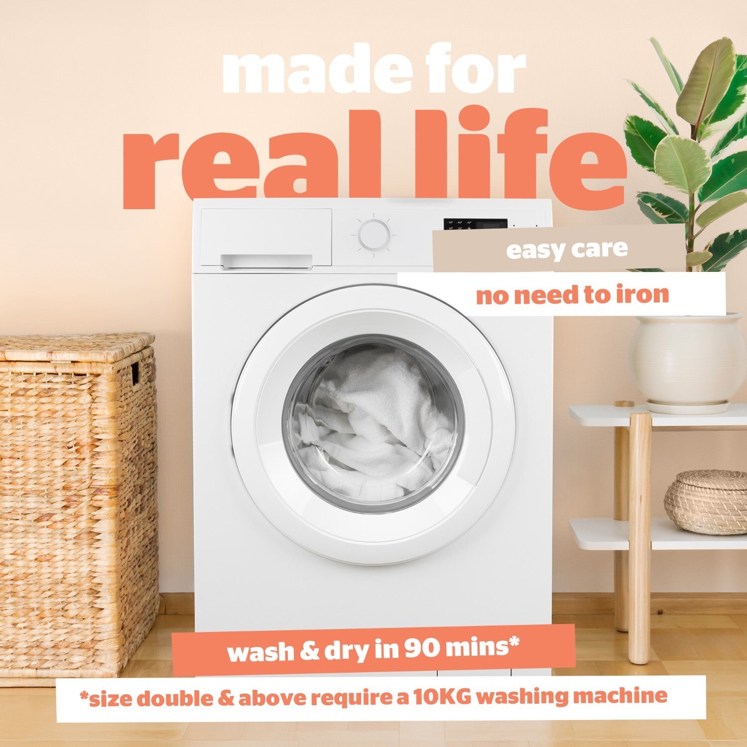 The duvet is fully machine washable, and dries within 90 minutes to have it ready to use again at bedtime. Home wash in a standard UK washing machine (8kg). Note, Double, King and Super King sizes require a large capacity washing machine (10kg).