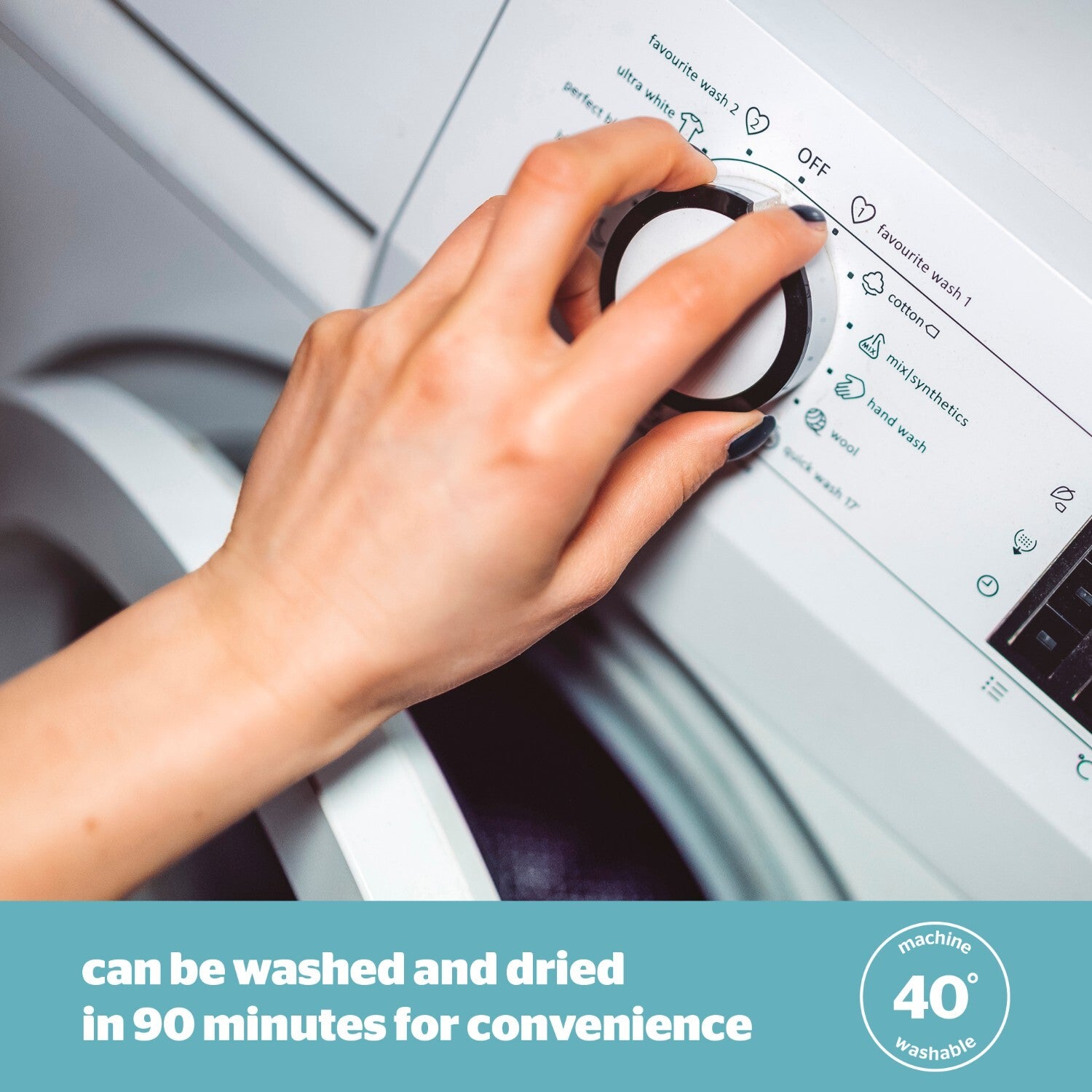 The duvet is fully machine washable, and dries within 90 minutes to have it ready to use again at bedtime. Home wash in a standard UK washing machine (8kg). Note, Double, King and Super King sizes require a large capacity washing machine (10kg).