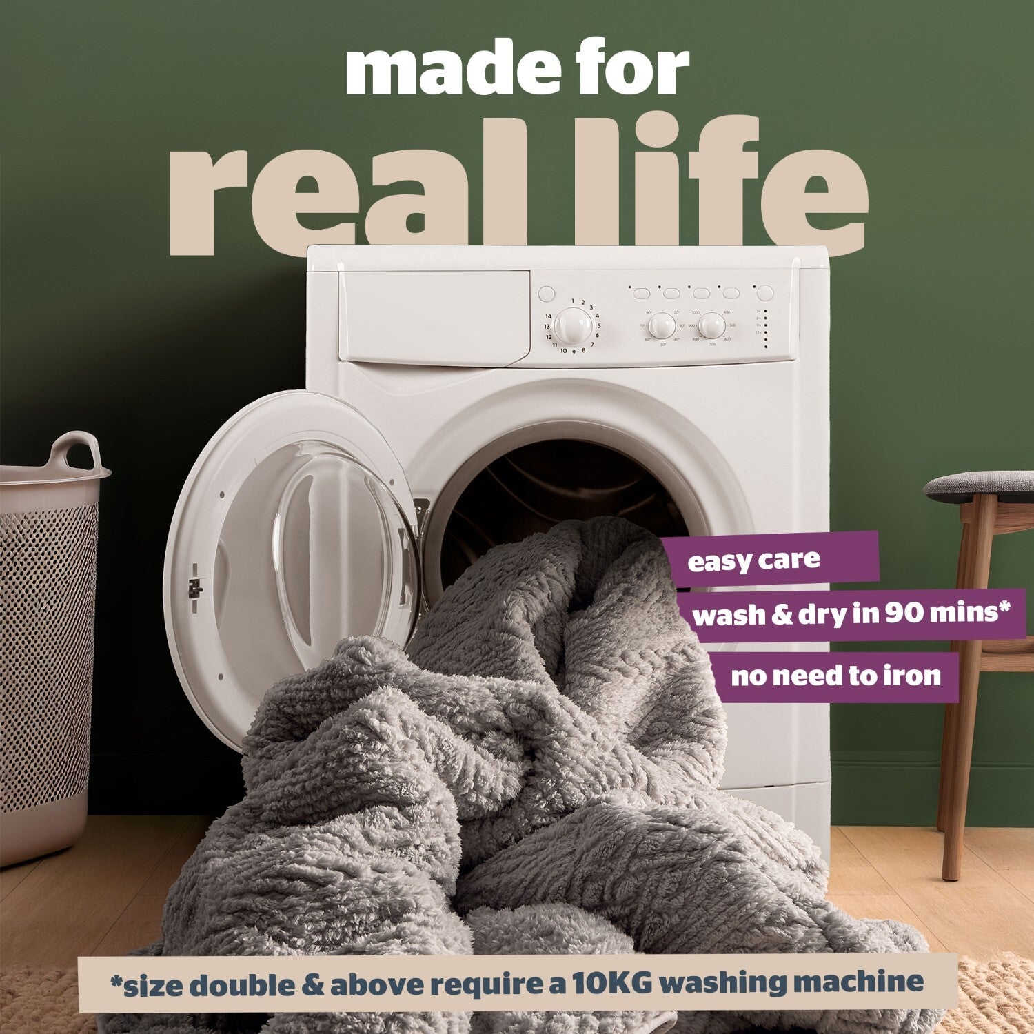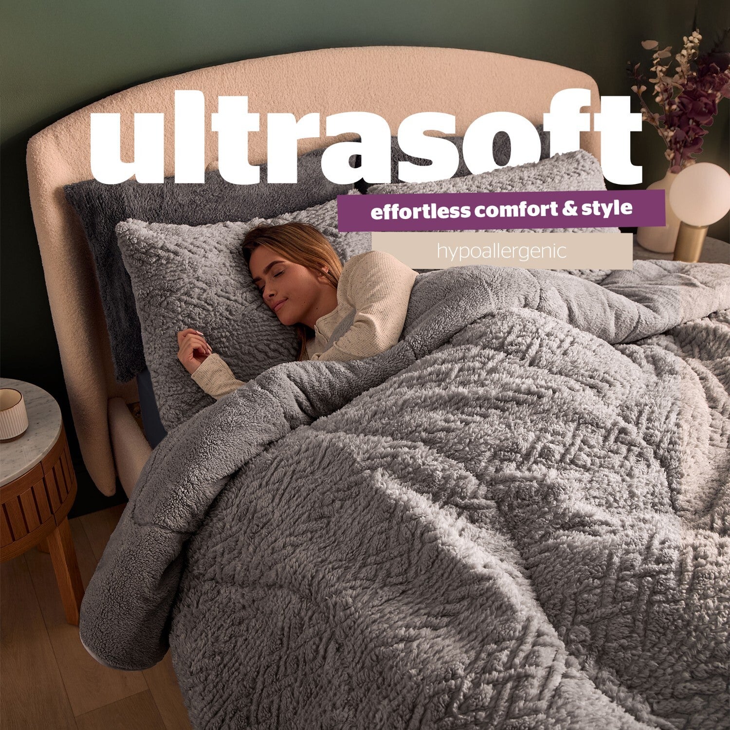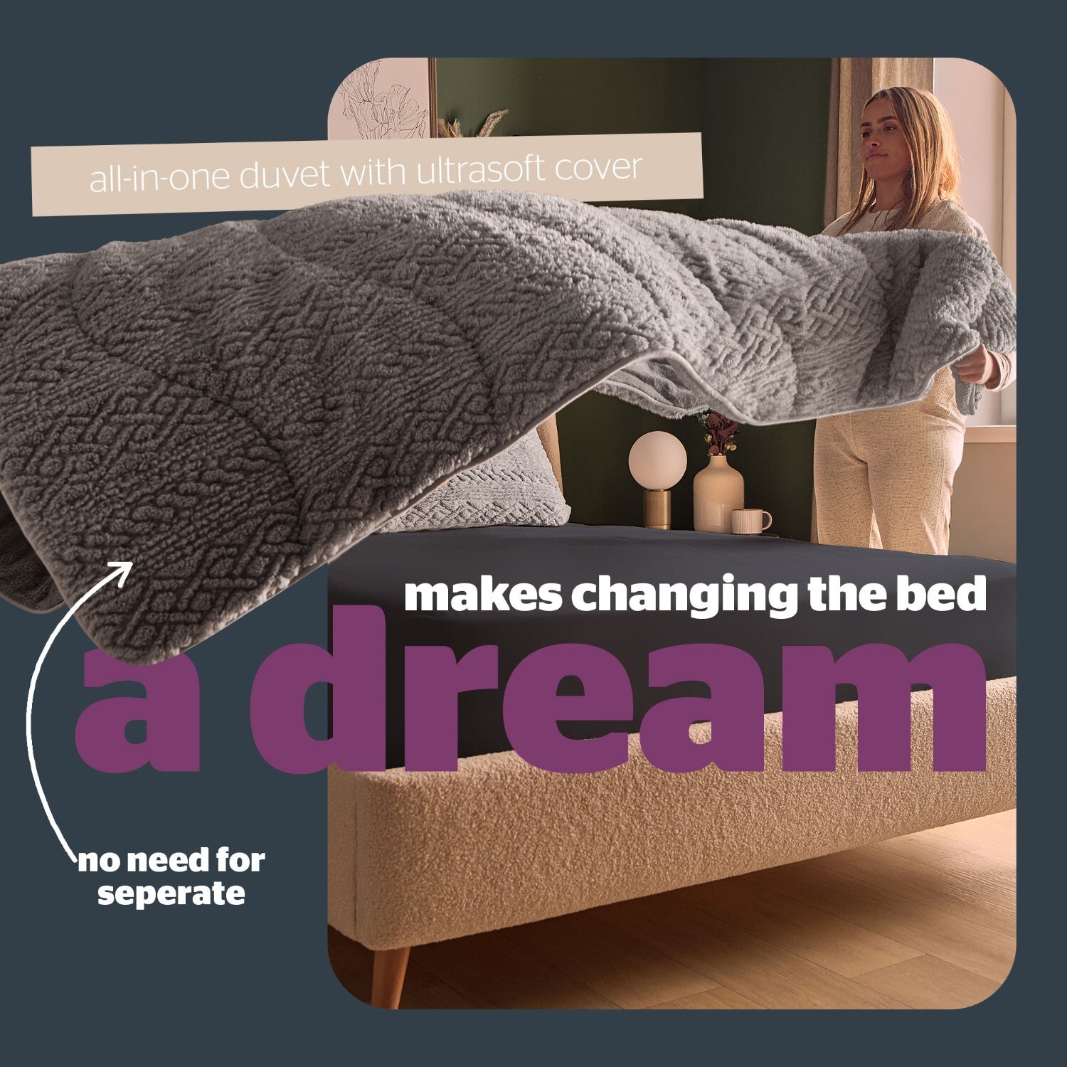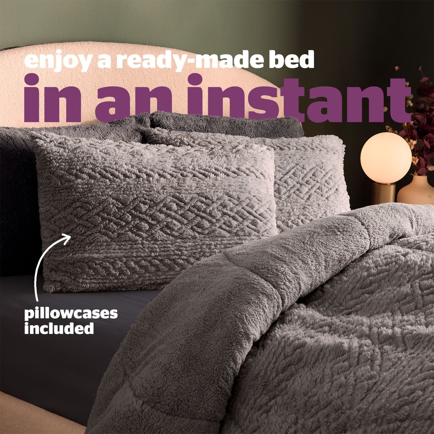 Snuggle into a cocoon of ultra-soft comfort. The Silentnight Teddy Fleece Coverless Duvet Set brings effortless cosiness to your bedroom. It includes a ready-made duvet with a matching pillowcase, both in a stylish cable knit embossed teddy fleece texture. Soft to the touch, the duvet is warm and comforting, perfect for hibernation over the colder winter months.