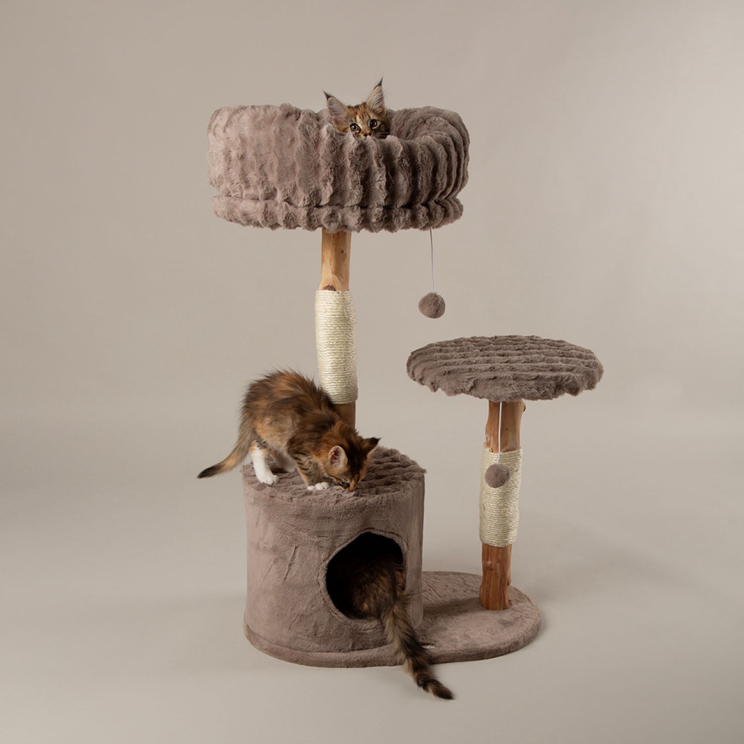 The removable cushion in the hide is machine washable for easy care. Built from strong pear wood and sisal, this tree is sturdy, stylish and simple to assemble.