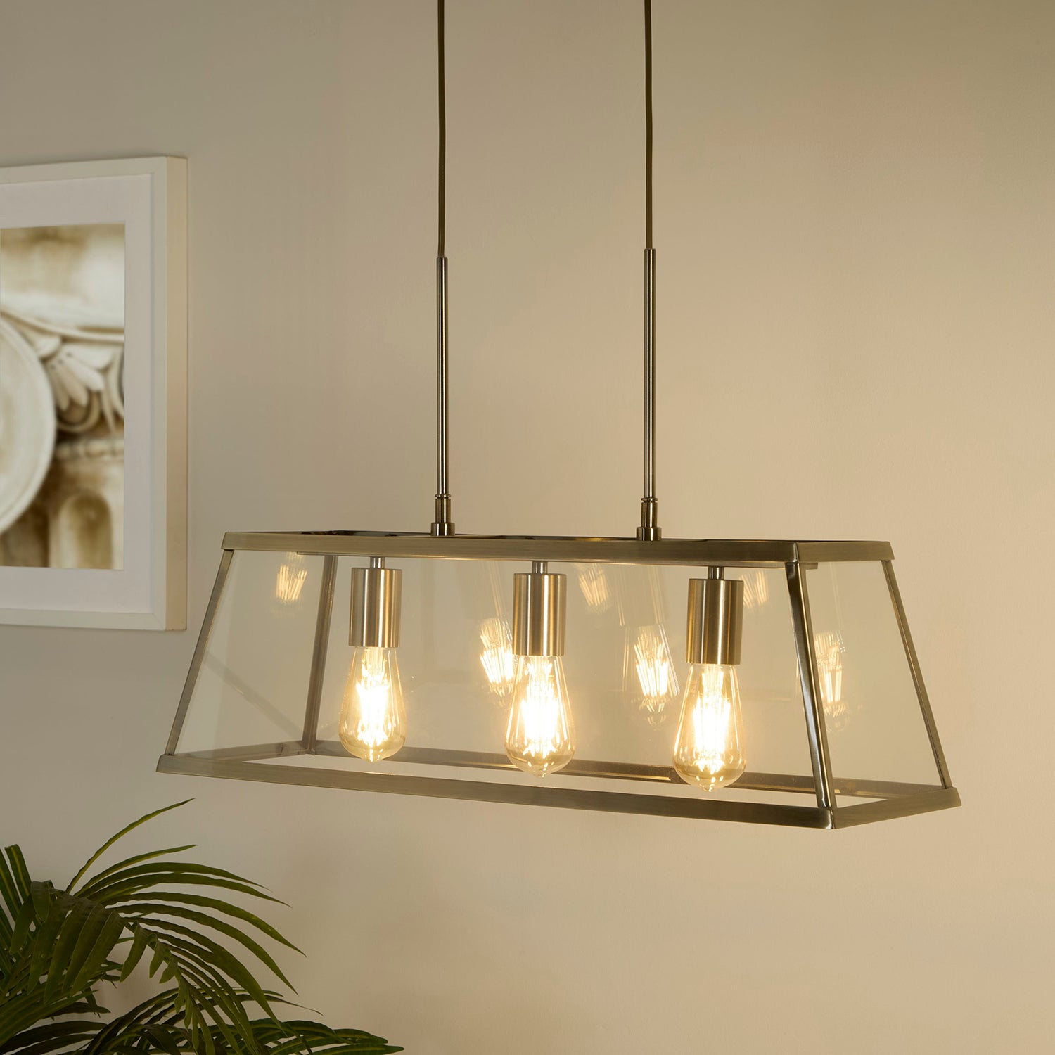 This modern lantern-style pendant light has a sleek brass frame and clear glass panels, perfect for stylish ambiance.