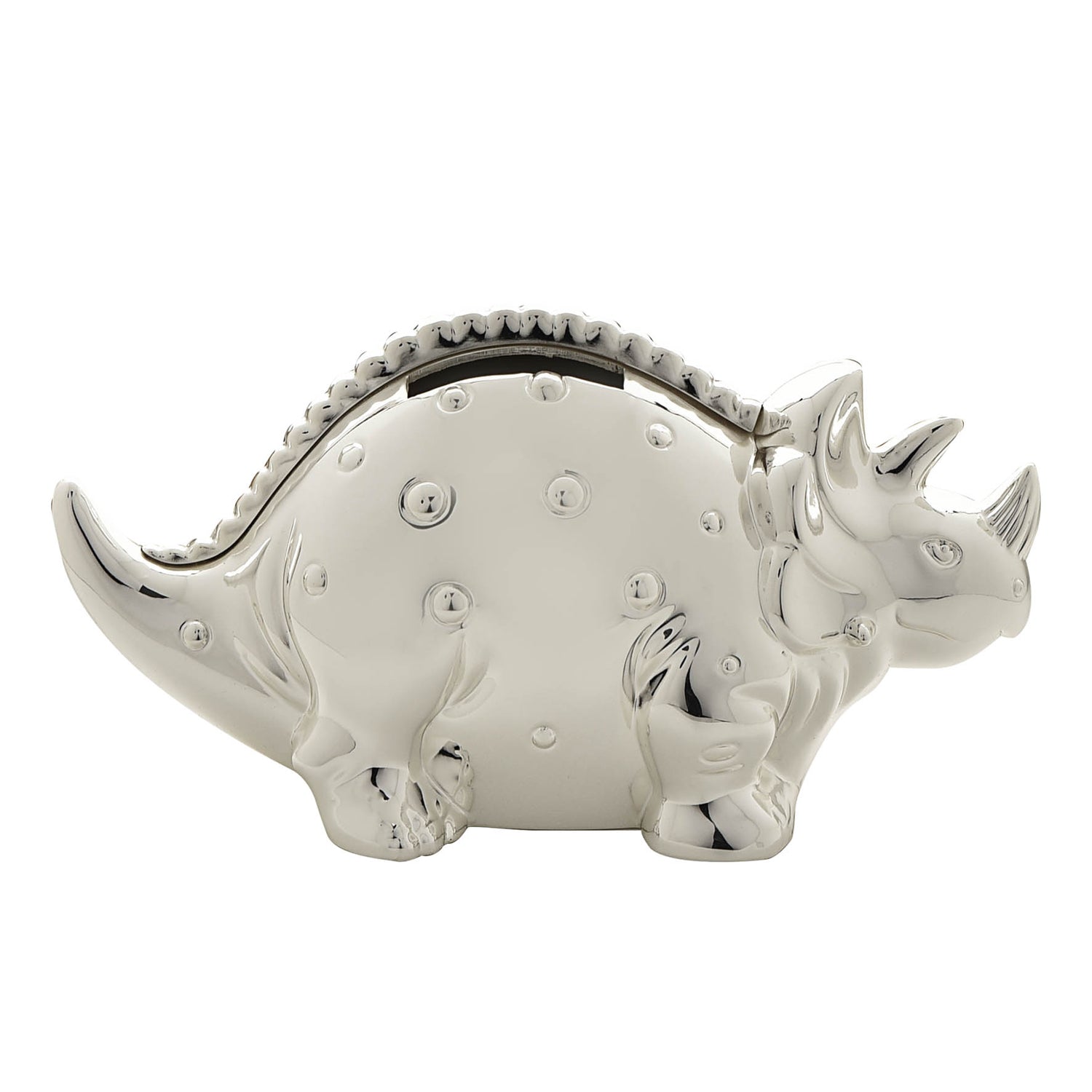 This wonderful keepsake provides glistening decoration for the nursery of new family arrivals which will be cherished eternally. The real silver plated money box offers great attention to detail which perfectly captures the charm and wonder of dinosaurs. It features a combination of textured and smooth finishes, complete with large money slot for saving coins and easy-to-remove rubber bung on the base.
