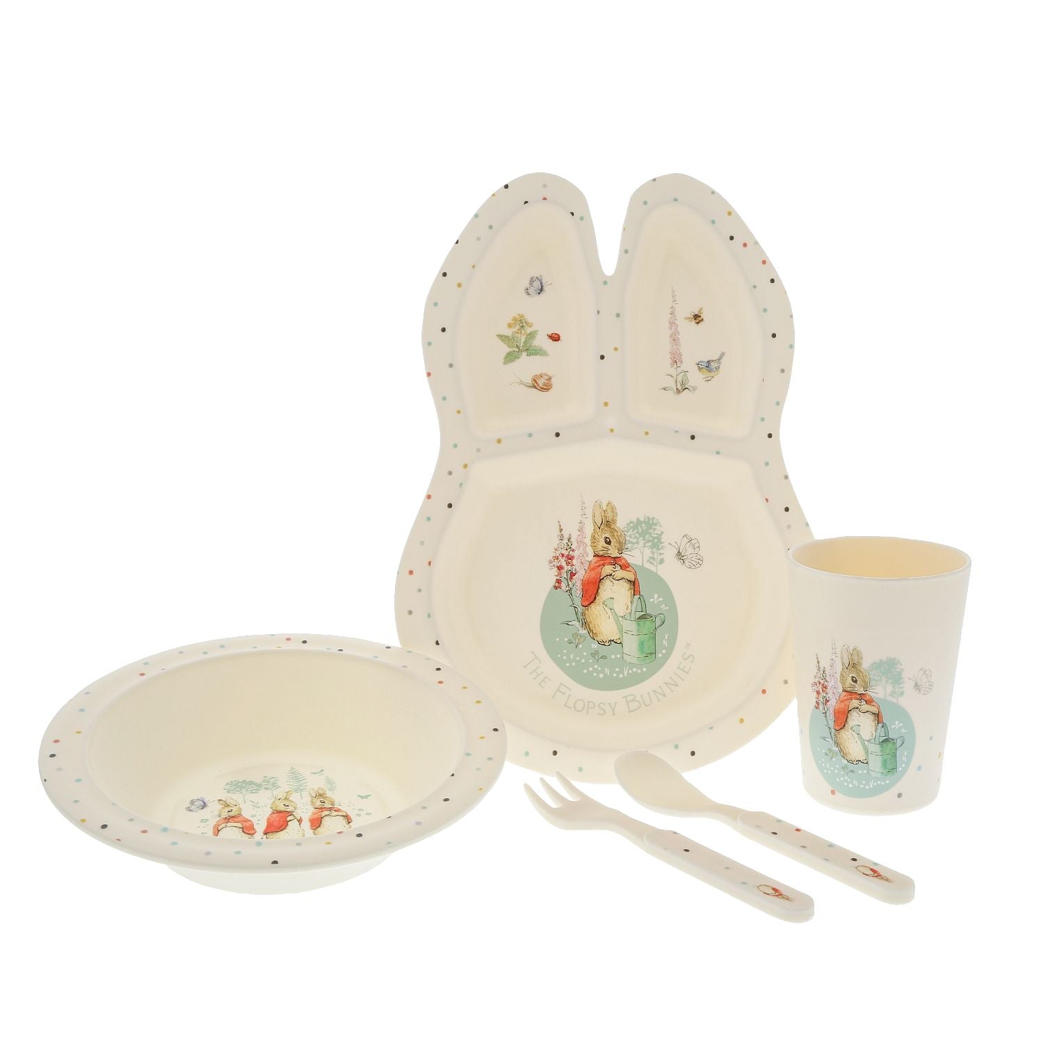 There's nothing quite like a fun Flopsy motif to entice those little tummies to clear their plates. Make mealtimes fun and practical with this dinner set. This highly durable dinner set can be used at home, in the garden, or on the go.