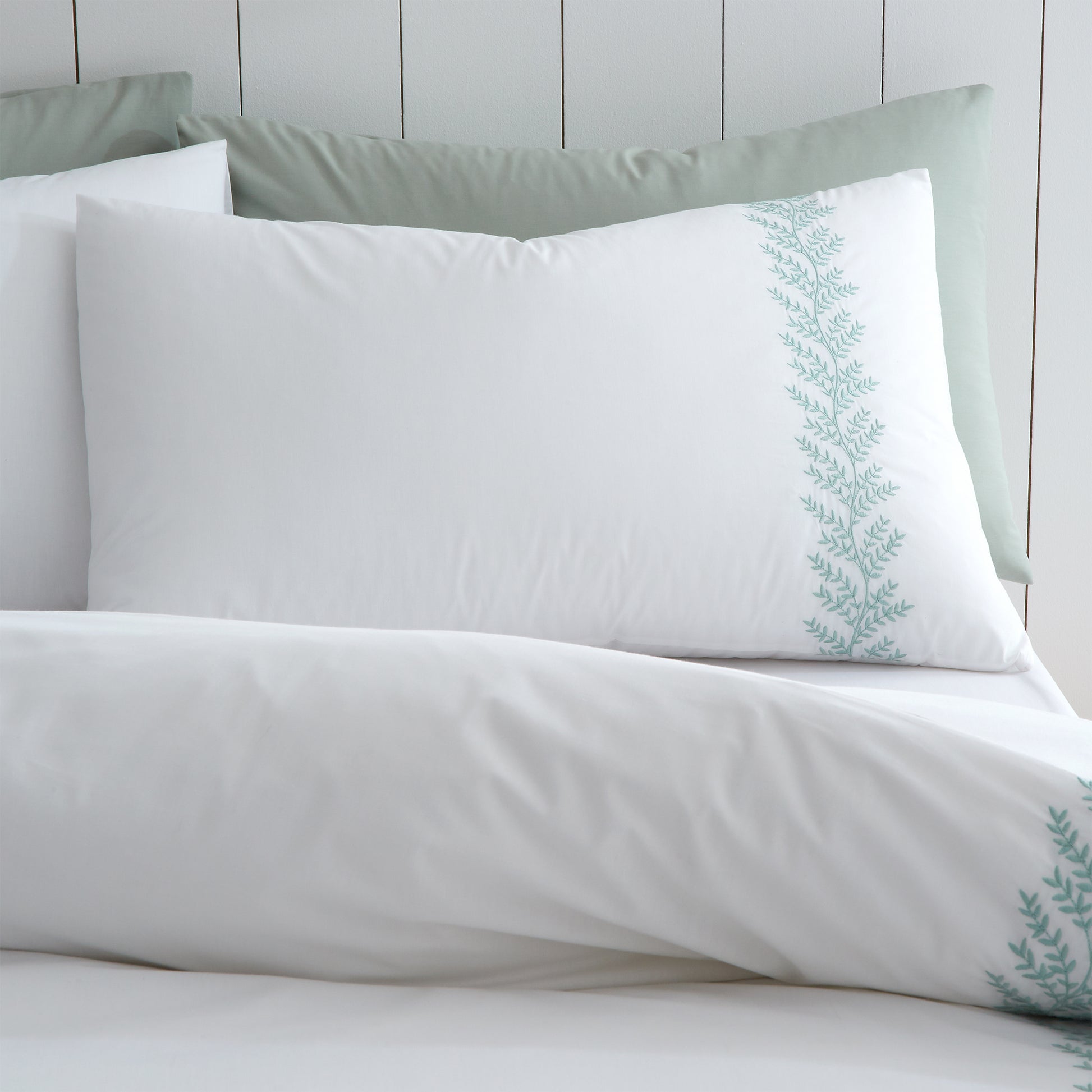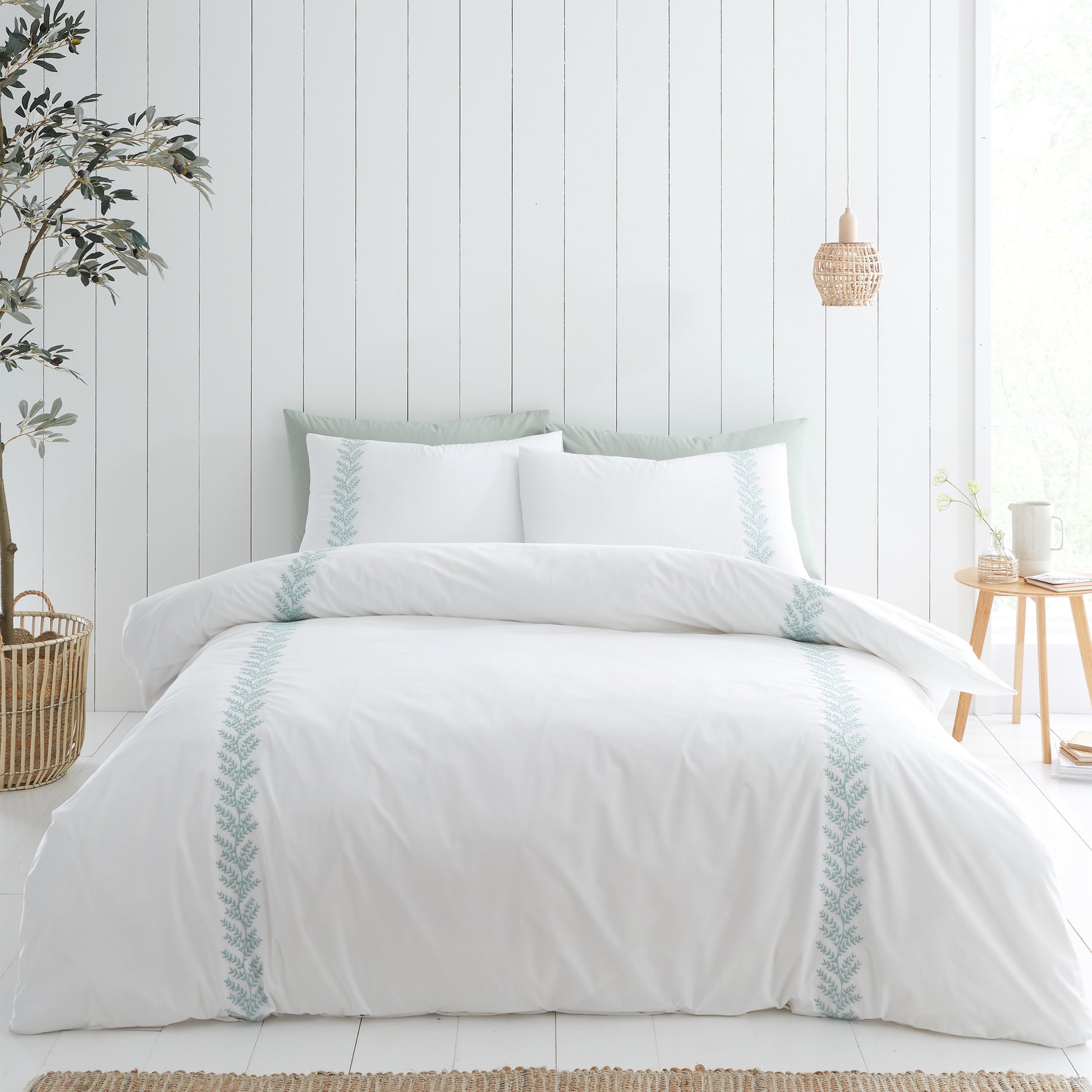 The exquisite white fabric is beautifully adorned with delicate green leaf detailing for an understated touch of traditional elegance.
