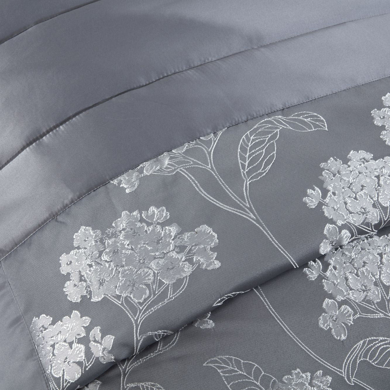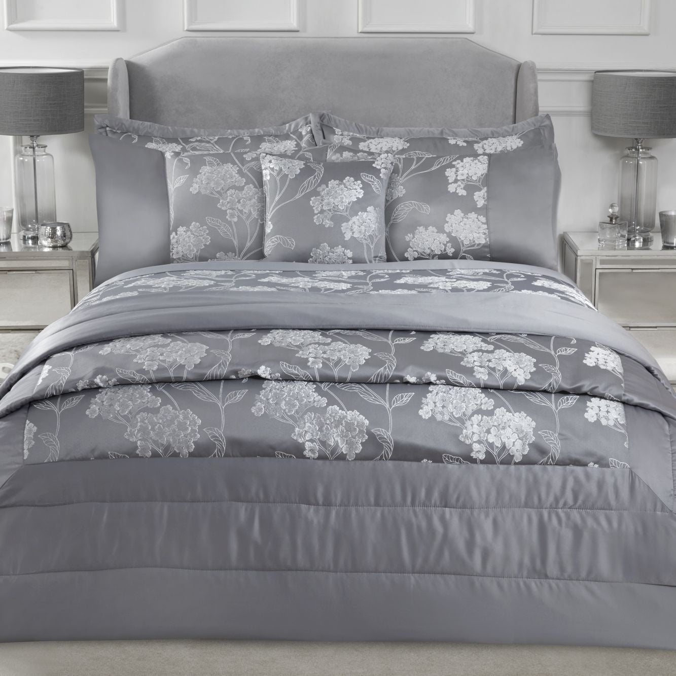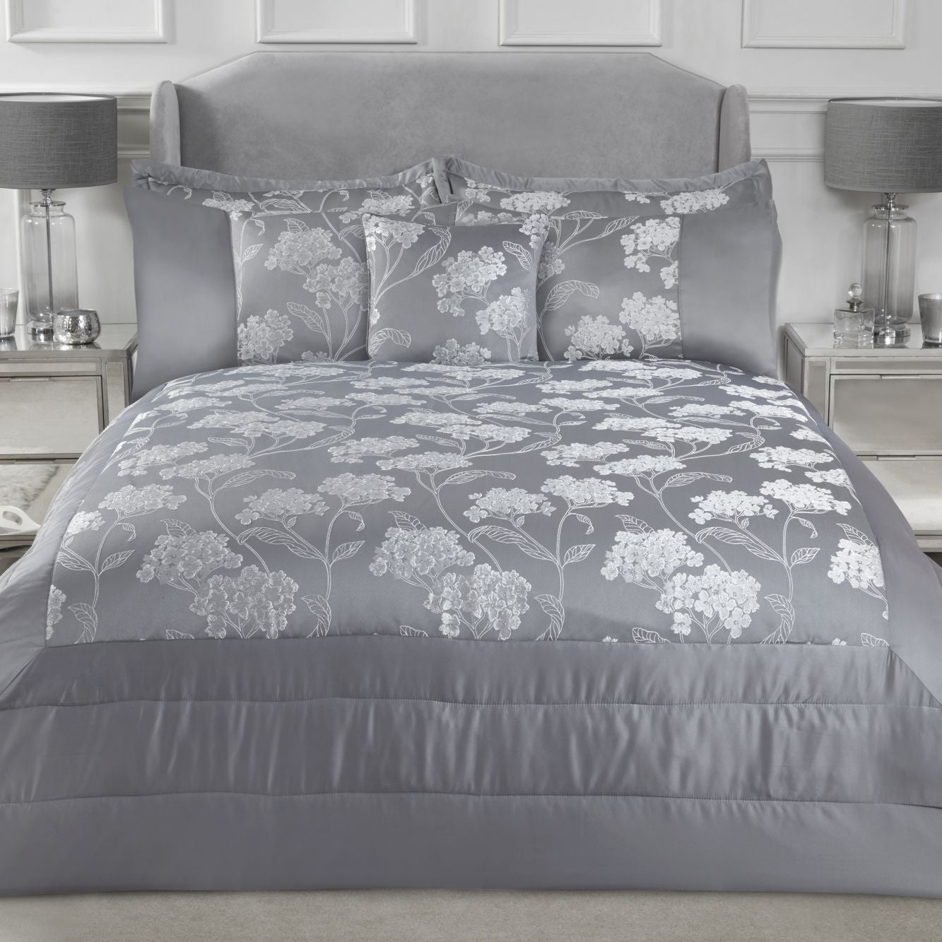 Welcome to a world of elegance and luxury with the Silver Blossom Embellished Jacquard Quilted Bedspread Set.