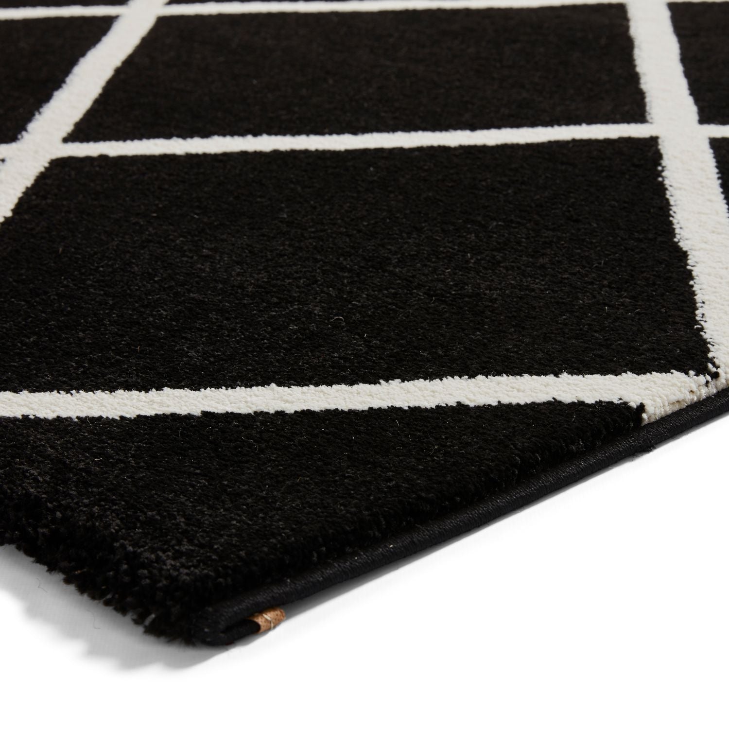 The Brooklyn Modern Diamond Soft Hand Carved Rug in Black/White, the perfect addition to any living room. This rug is made from high-quality polypropylene, making it highly durable and perfect for high-traffic areas.