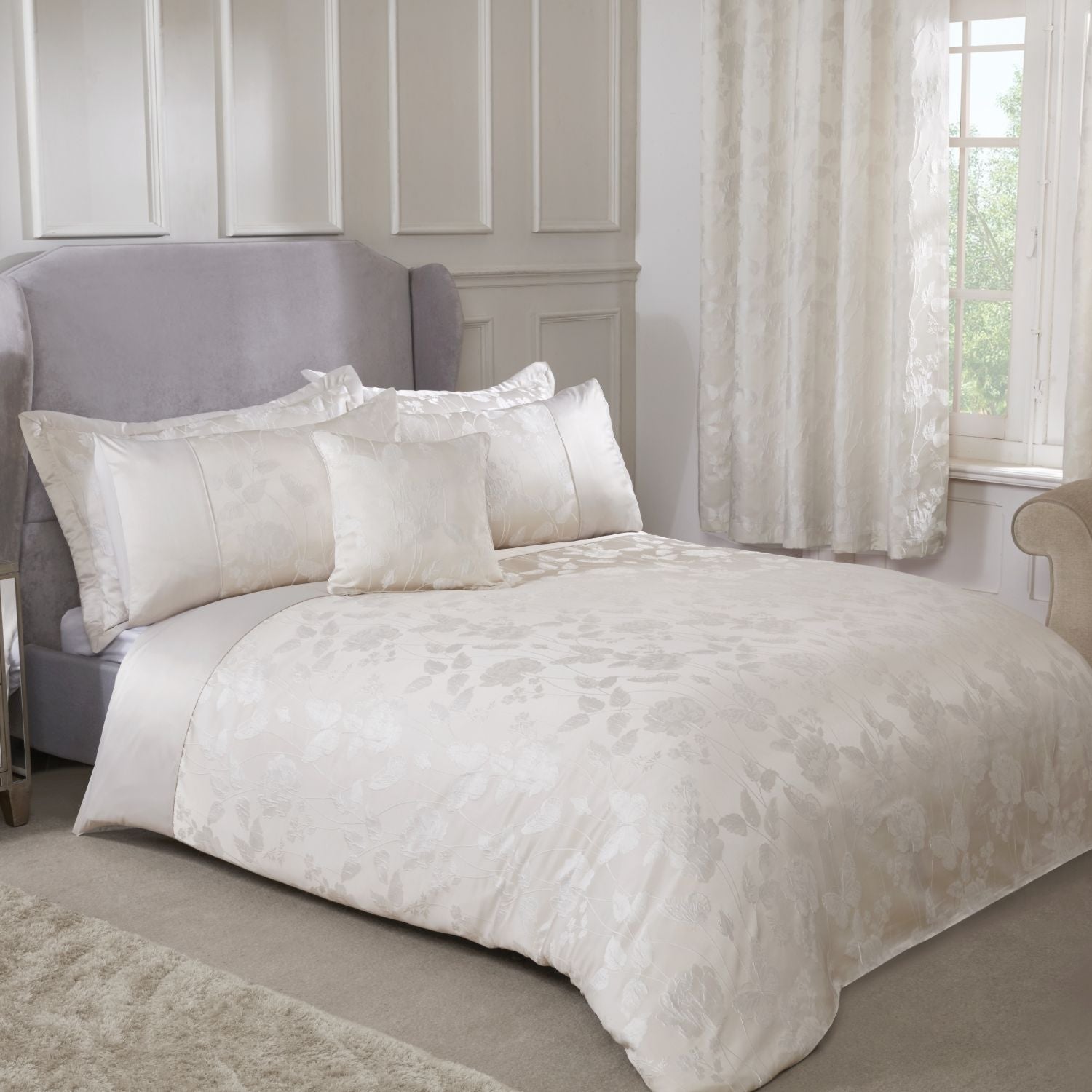 Bring a touch of beauty to your bedroom with the Cream Butterfly Meadow Embellished Jacquard Duvet Set!