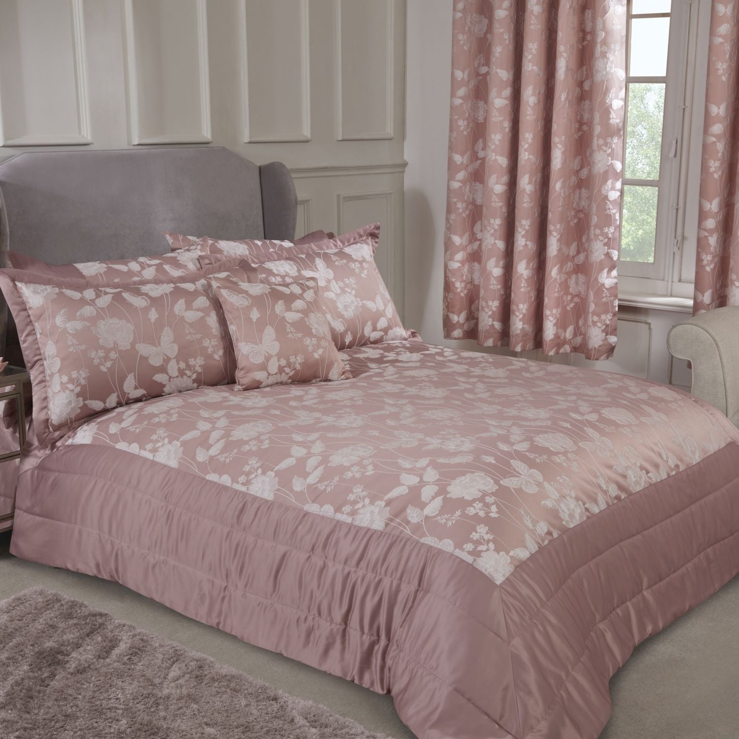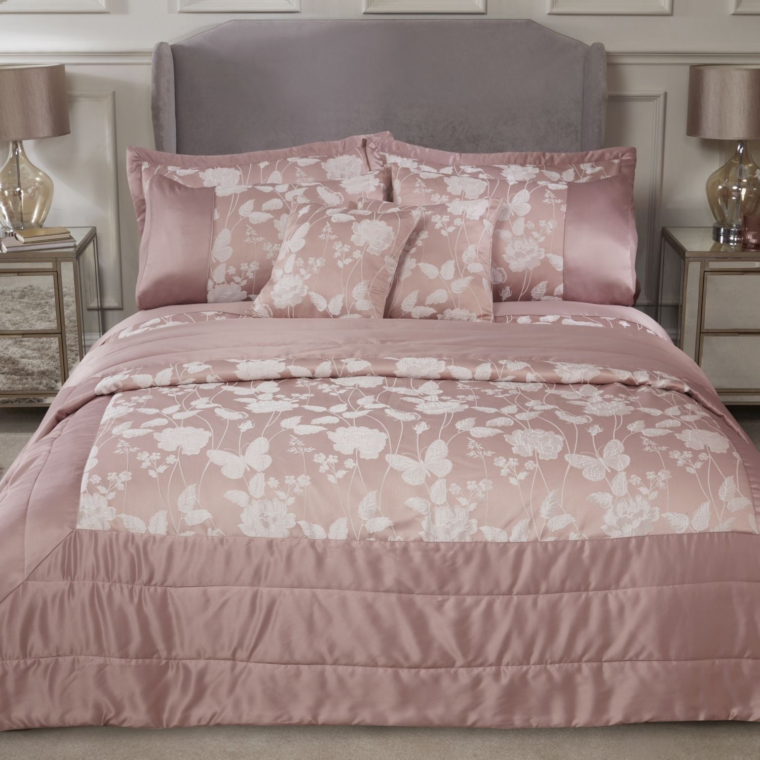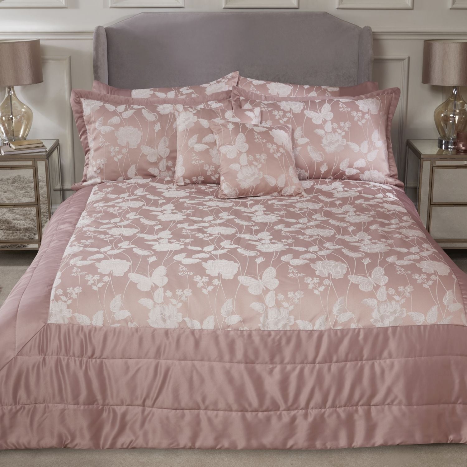 Introducing the Butterfly Meadow Blush Pink Bedspread Set, with its luxurious soft sateen finish border detail and central jacquard floral butterfly design.