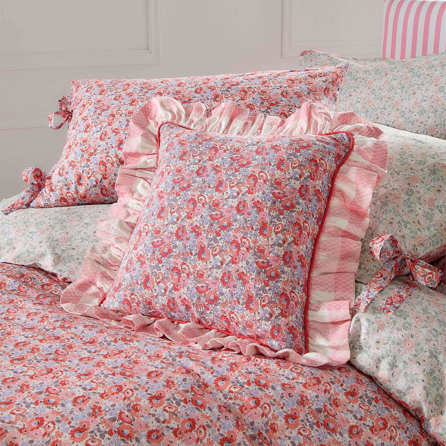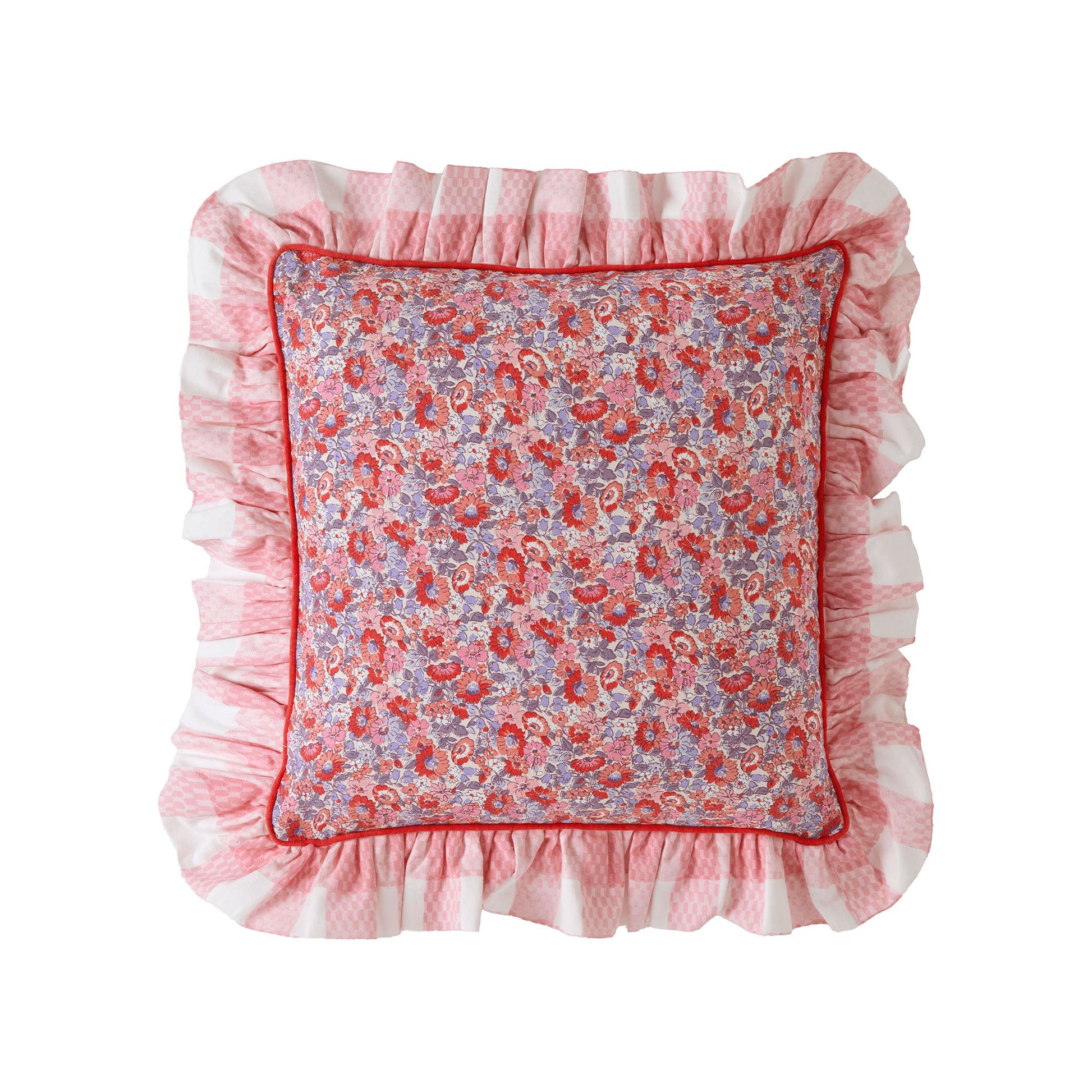 A treasured archive favourite, the classic Ditsy archive print features dainty blooms in a joyful palette of red, coral, soft pink and lilac. A large, pink gingham check is printed on to a soft cotton ruffle edge and a smart, red piped trim detail frames this joyful cushion. Add to your home for an artfully eclectic look.
