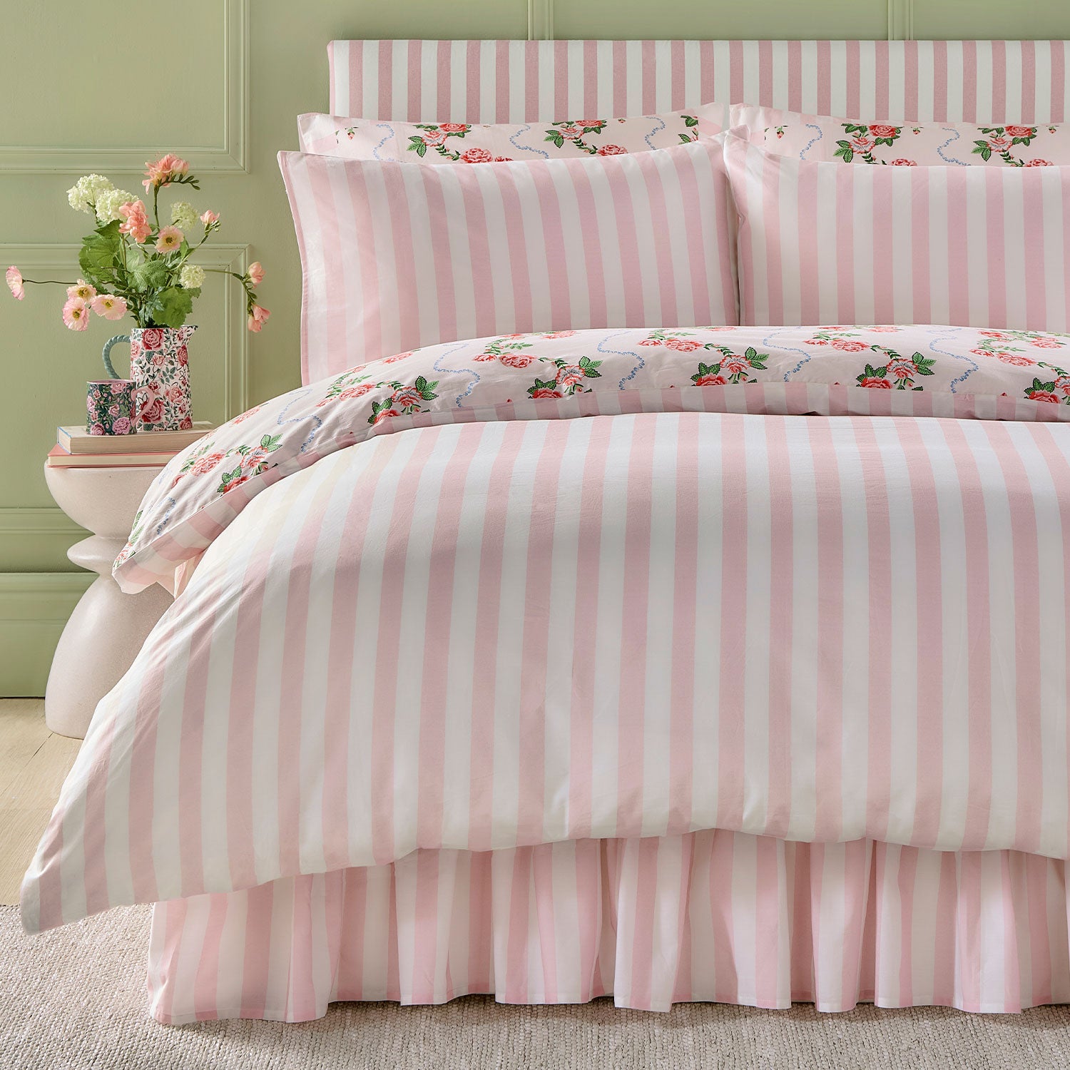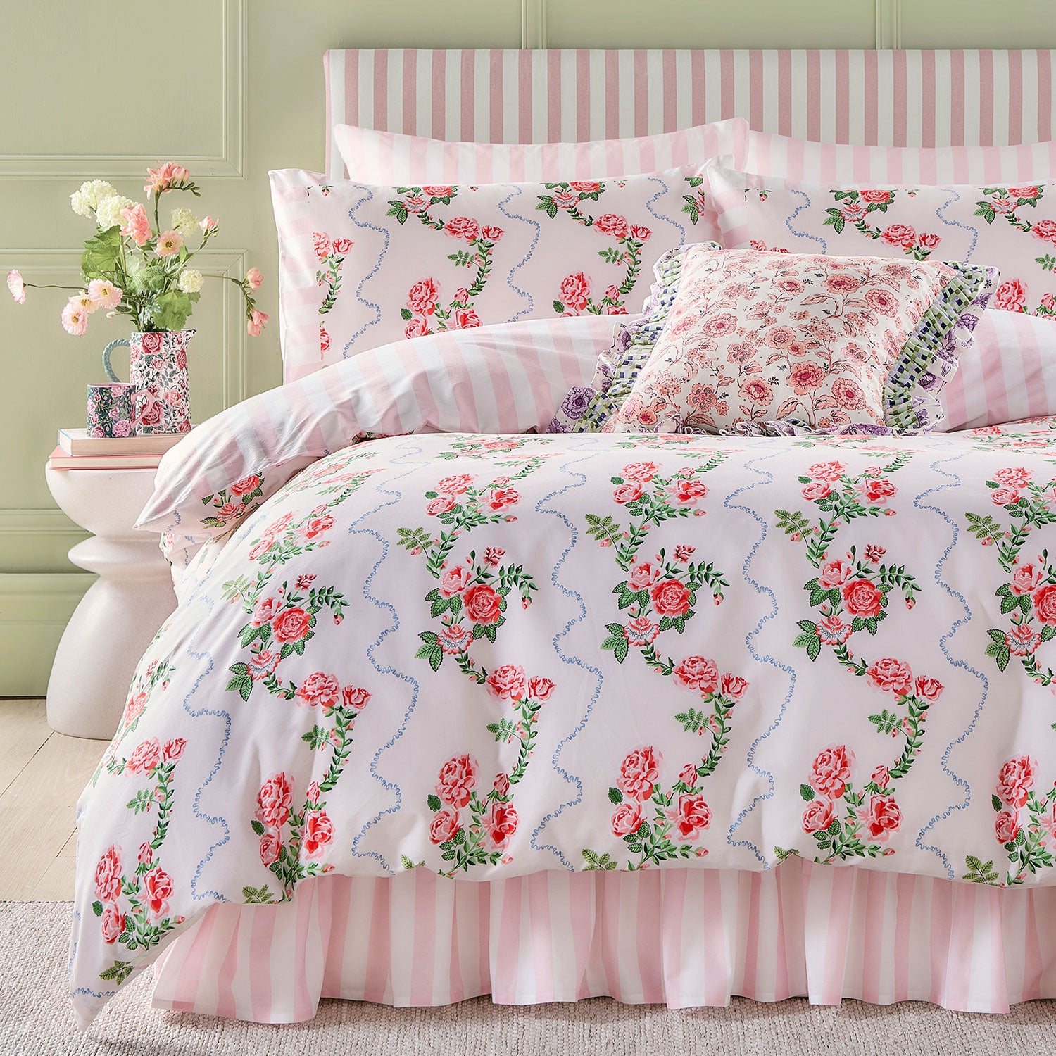 Made for dreamers, the beautiful Rose Flutter bedlinen is a modern take on a traditional classic. Hand painted roses dance amongst delicate foliage alongside a hand-painted ditsy wiggle which is contrasted with a bold, candy stripe.