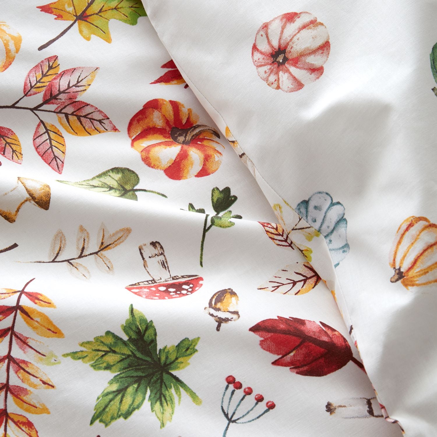 Bring the outdoors in with this autumnal inspired bedding, a symphony of pumpkins, leaves, and acorns in warm shades of oranges, browns, and greens and set against a pure white base. Fully reversible with a complementary pattern offering two seasonal looks in one. Created from easy-care recycled polyester and soft cotton, blended for every day. use.