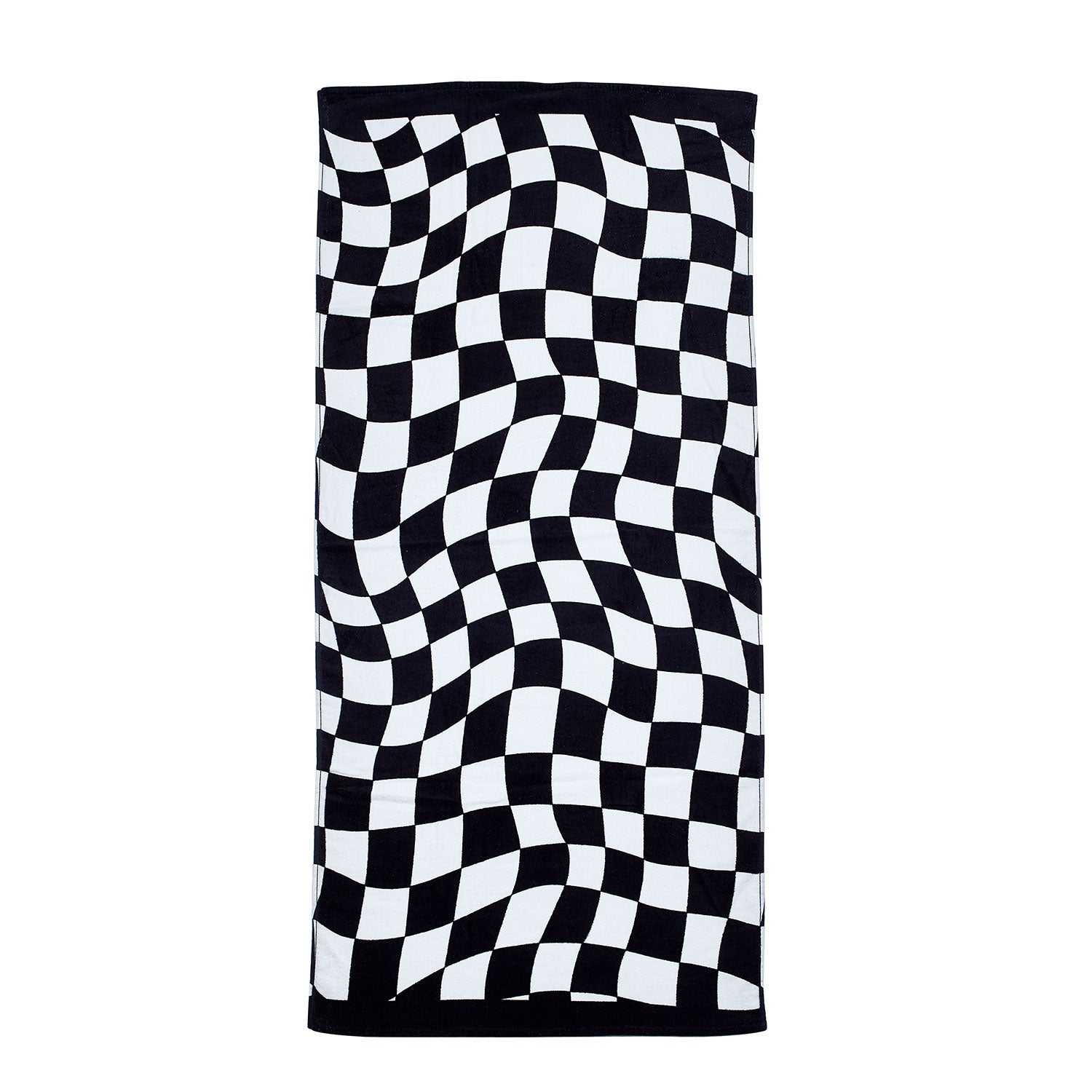 Make a splash with this chic beach towel, featuring a cool wavy checkerboard design in bold black and white. Crafted from cotton for a soft and durable beach towel, perfect for lounging by the waves or soaking up the sun.