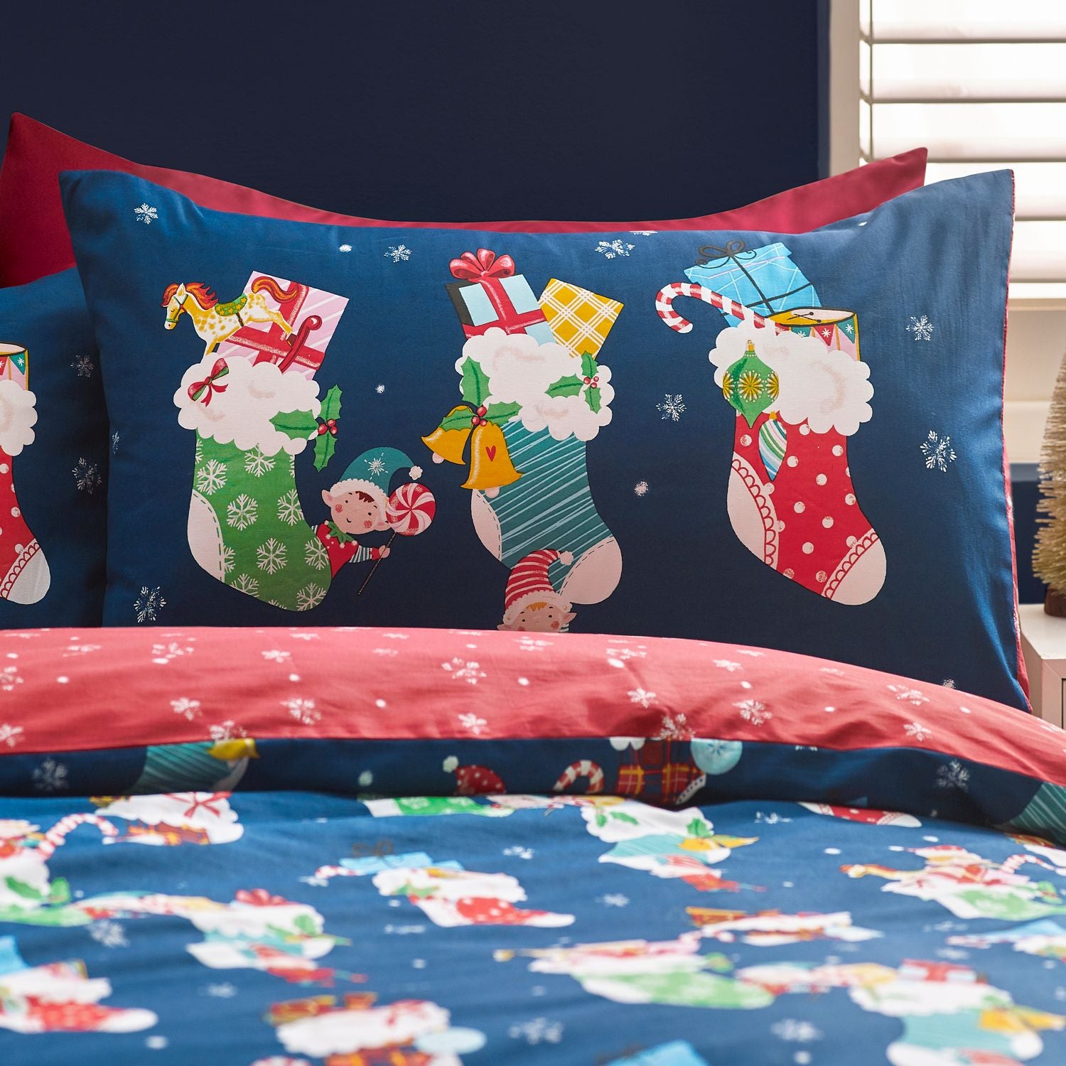 Bring festive cheer to your bedroom with this fun Christmas bedlinen. Featuring playful elves and stockings scattered across a dark backdrop, this charming design captures the magic of the season.