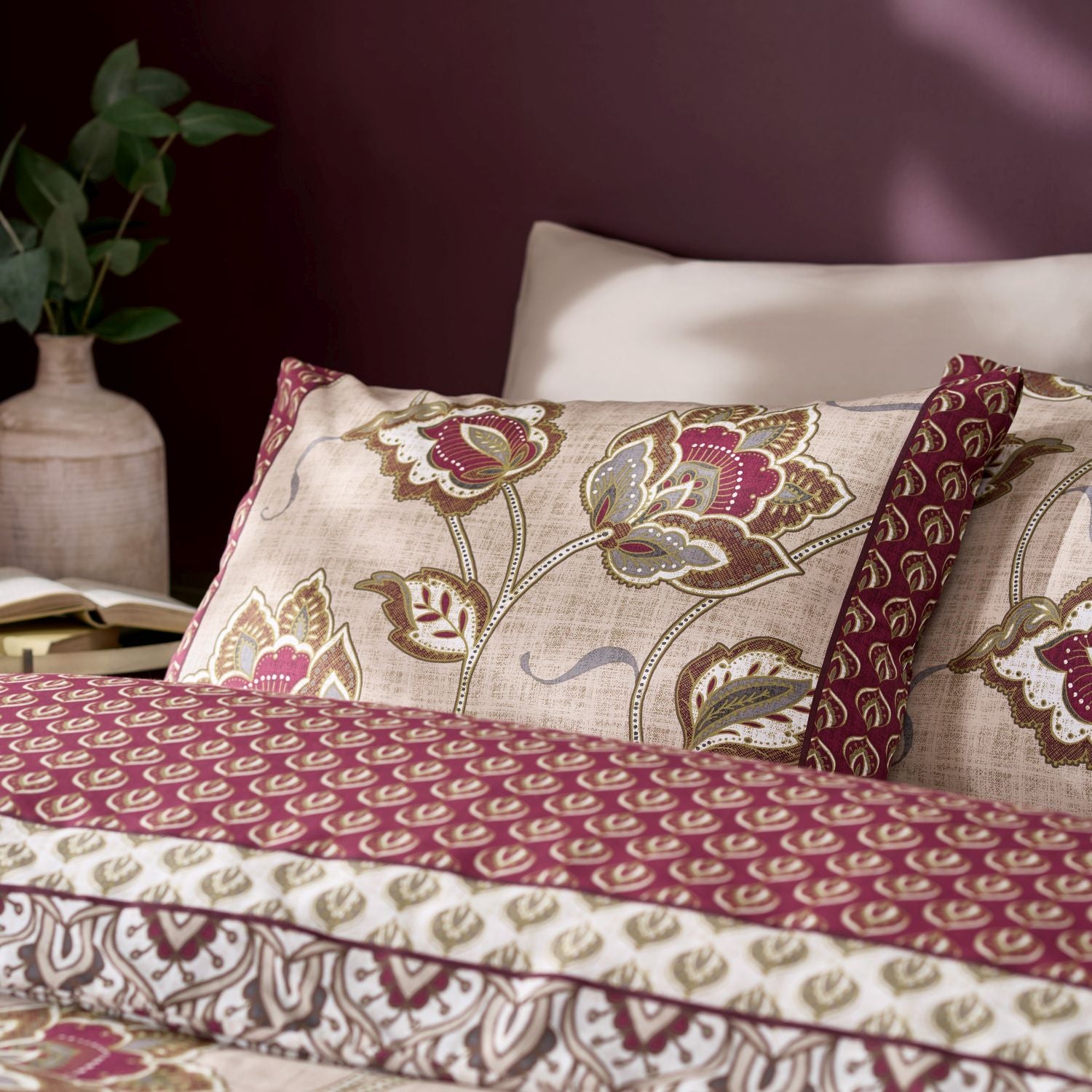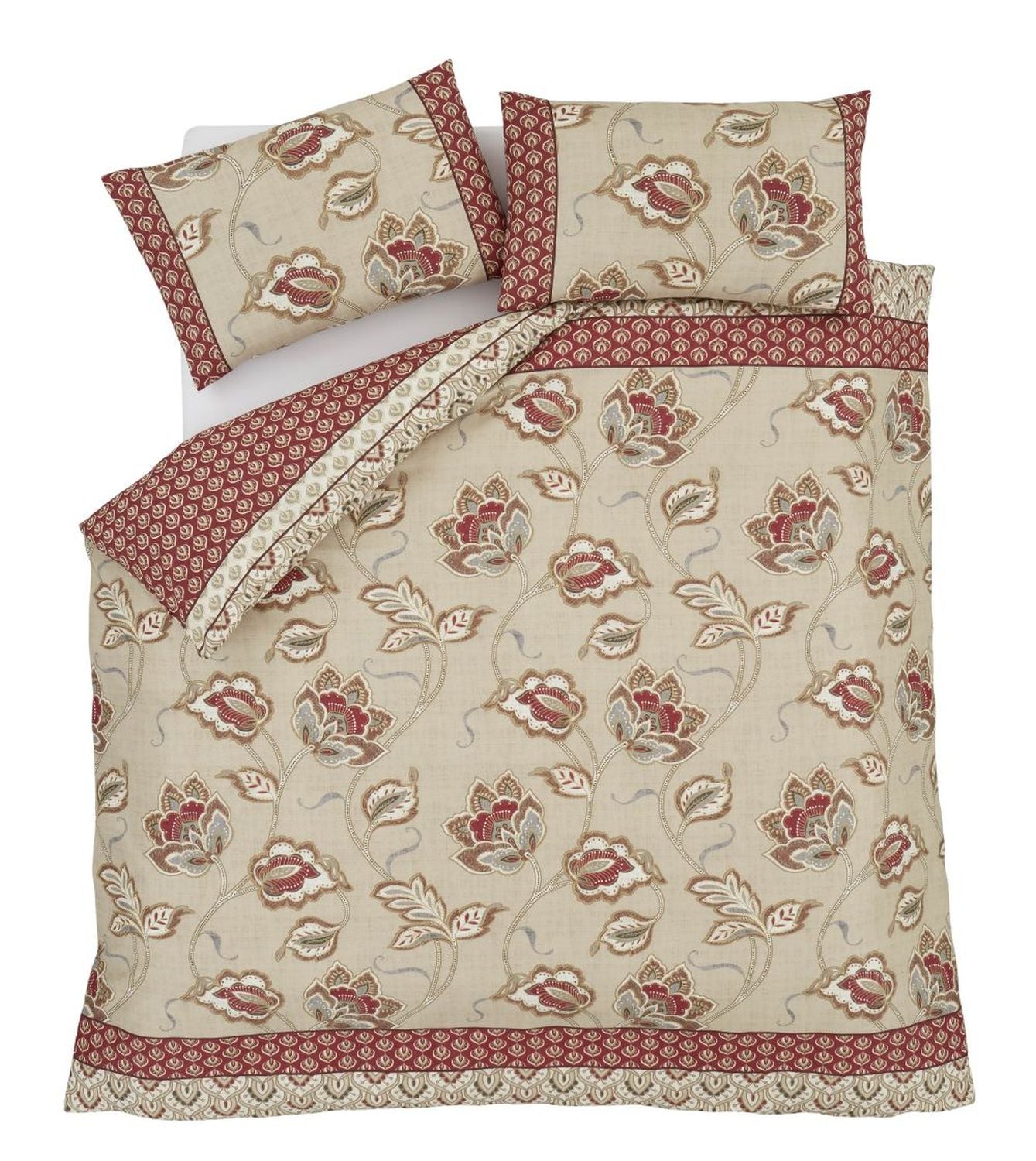This intricate paisley and leaf patterned bedding inspired by Kashmiri embroidery in a palette of rich deep red mixed with earthy tones gives this exotic design a sophisticated update. Created from easy-care recycled polyester and soft cotton, blended for everyday use.
