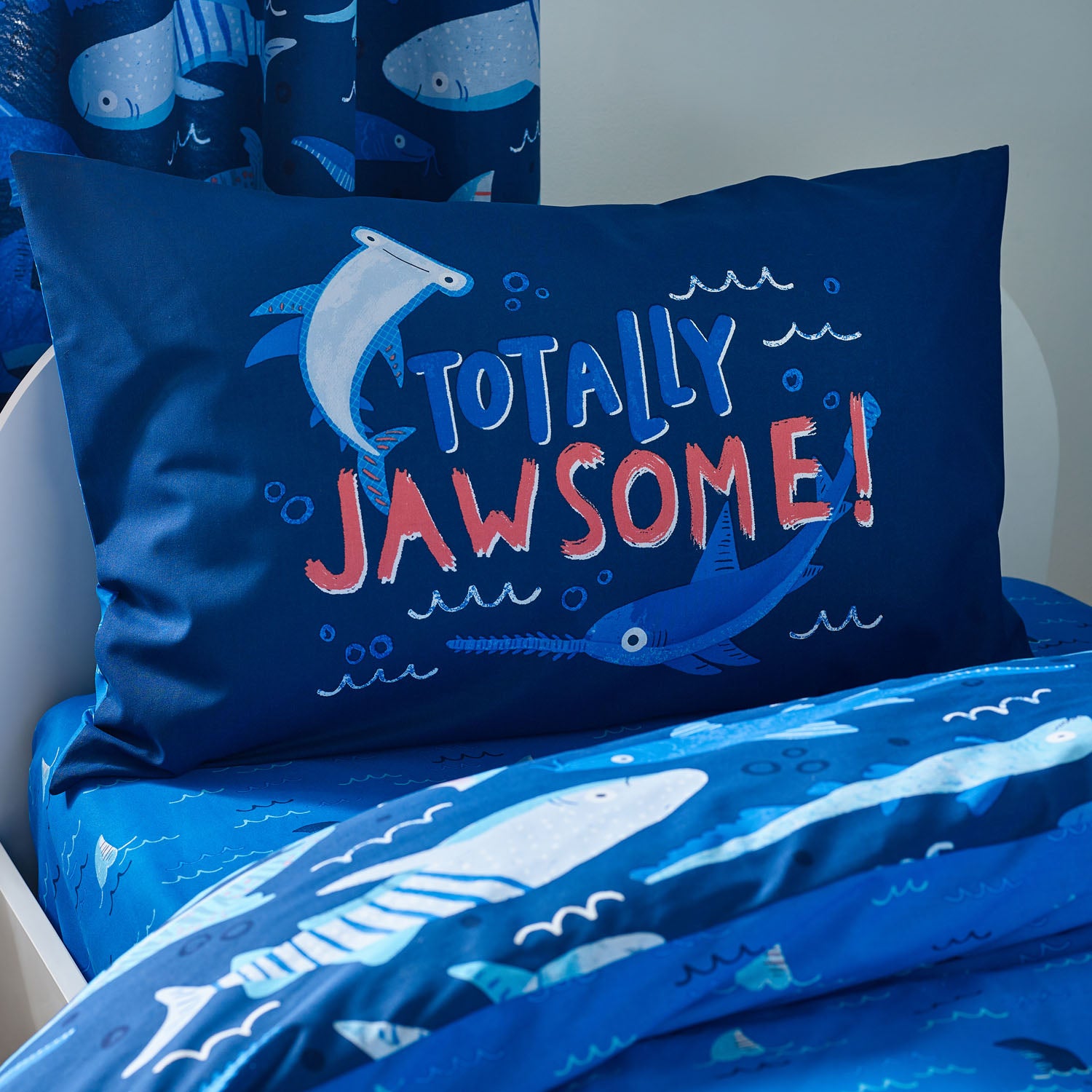 Dive into a sea of adventure with this totally Jawsome reversible duvet set, featuring playful sharks swimming across a deep blue background.