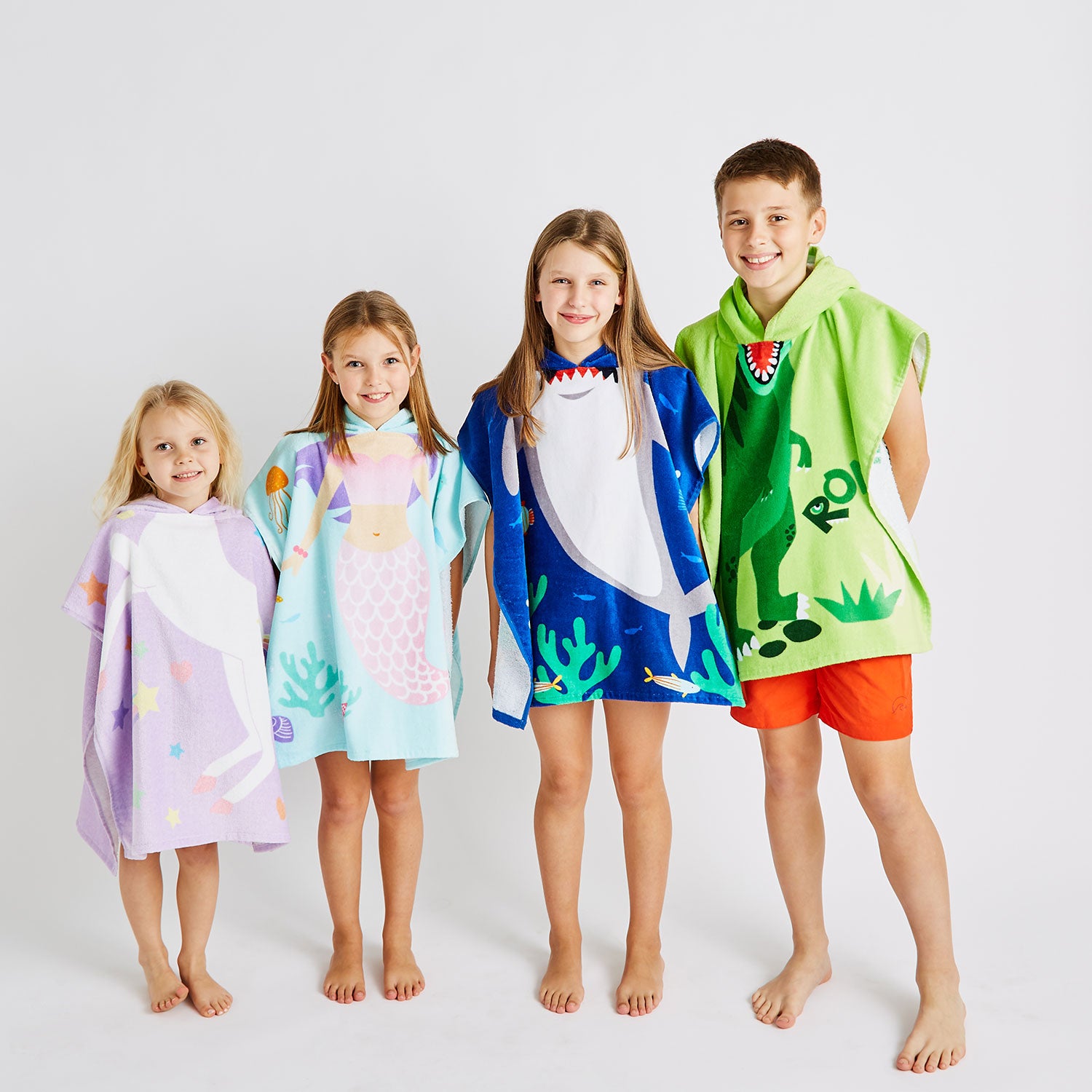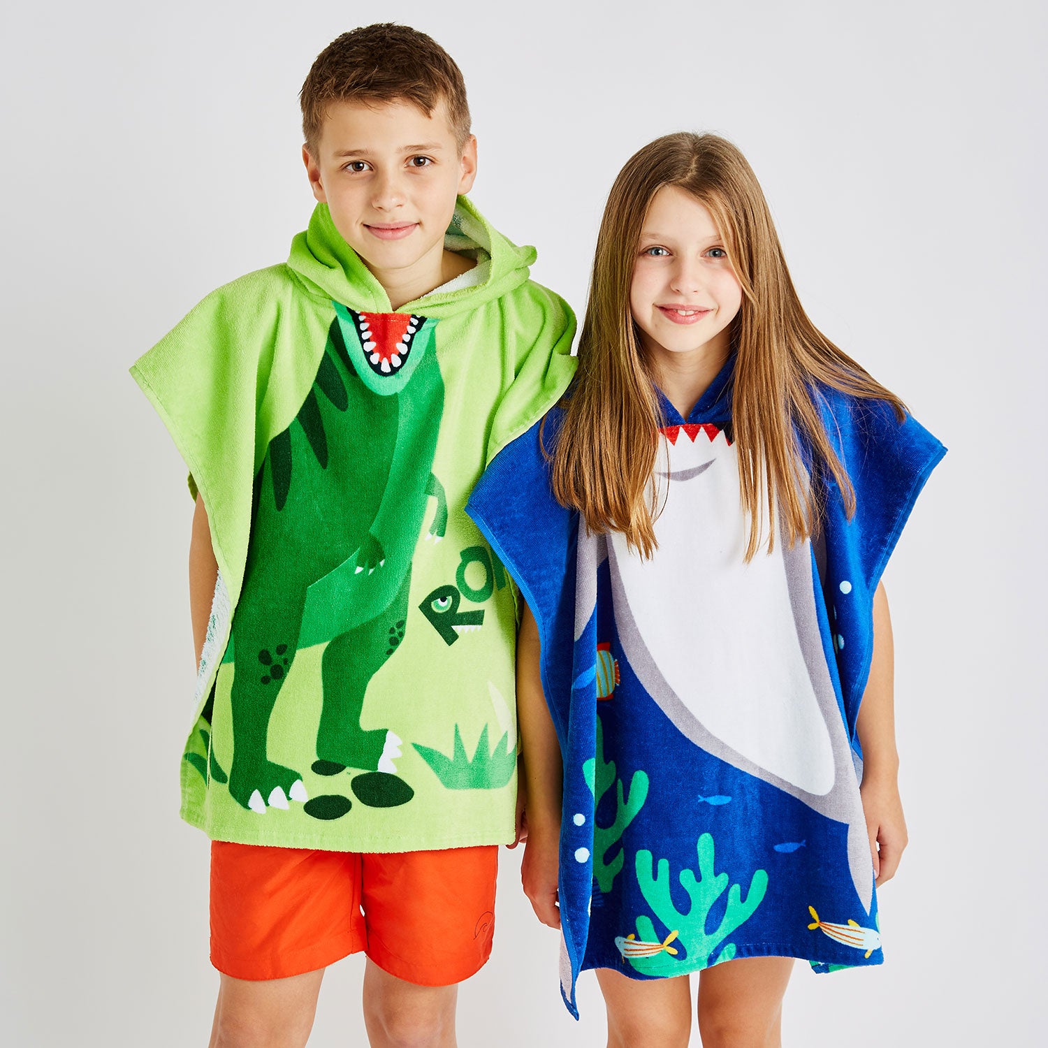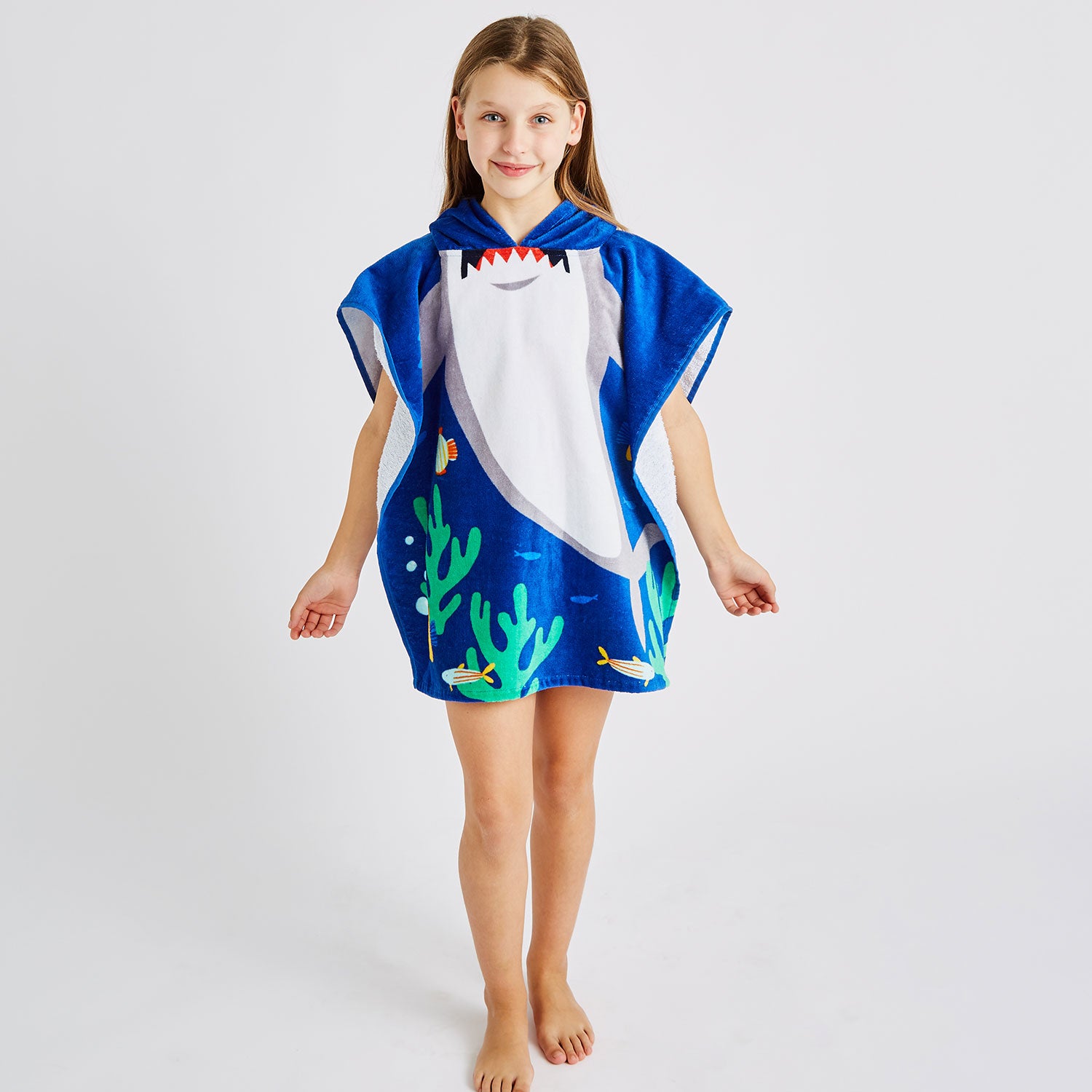 Watch as your little sharks embark on thrilling underwater quests with this fun towelling poncho. Crafted from soft and absorbent cotton towelling fabric, it quickly dries them off after water play while keeping them warm and cosy. Designed for convenience, the over-the-head hooded style makes it easy for kids to slip on and off either at the beach or after bath time.