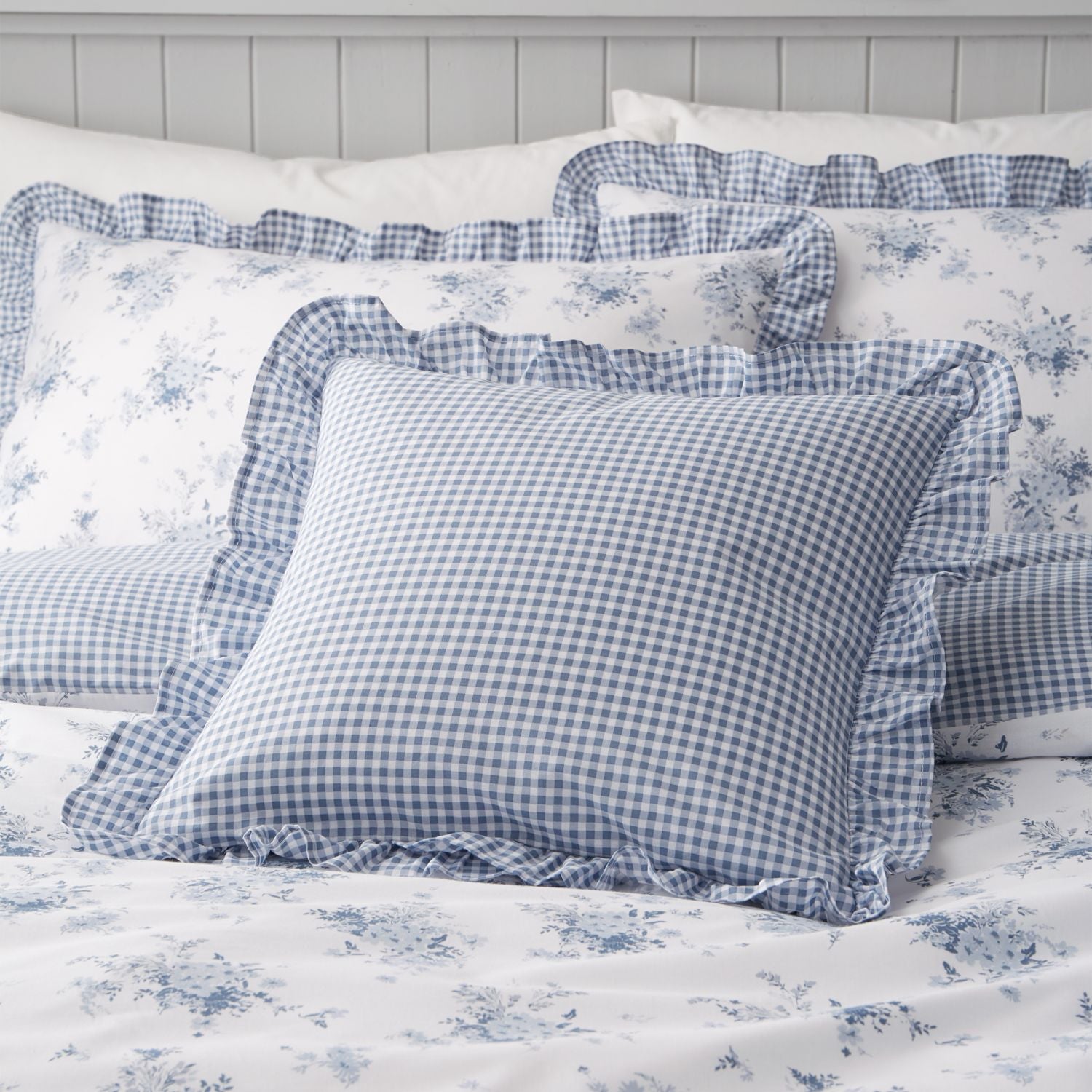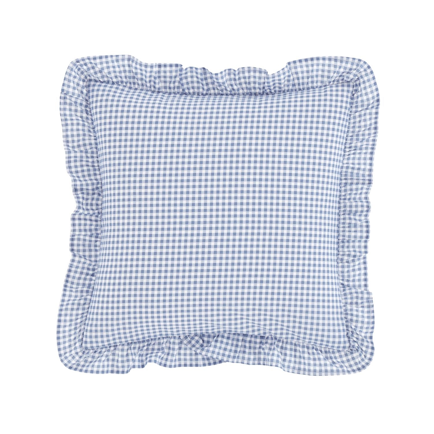 Bring the essence of the countryside into your home with this blue gingham cushion with pretty frill edge.
