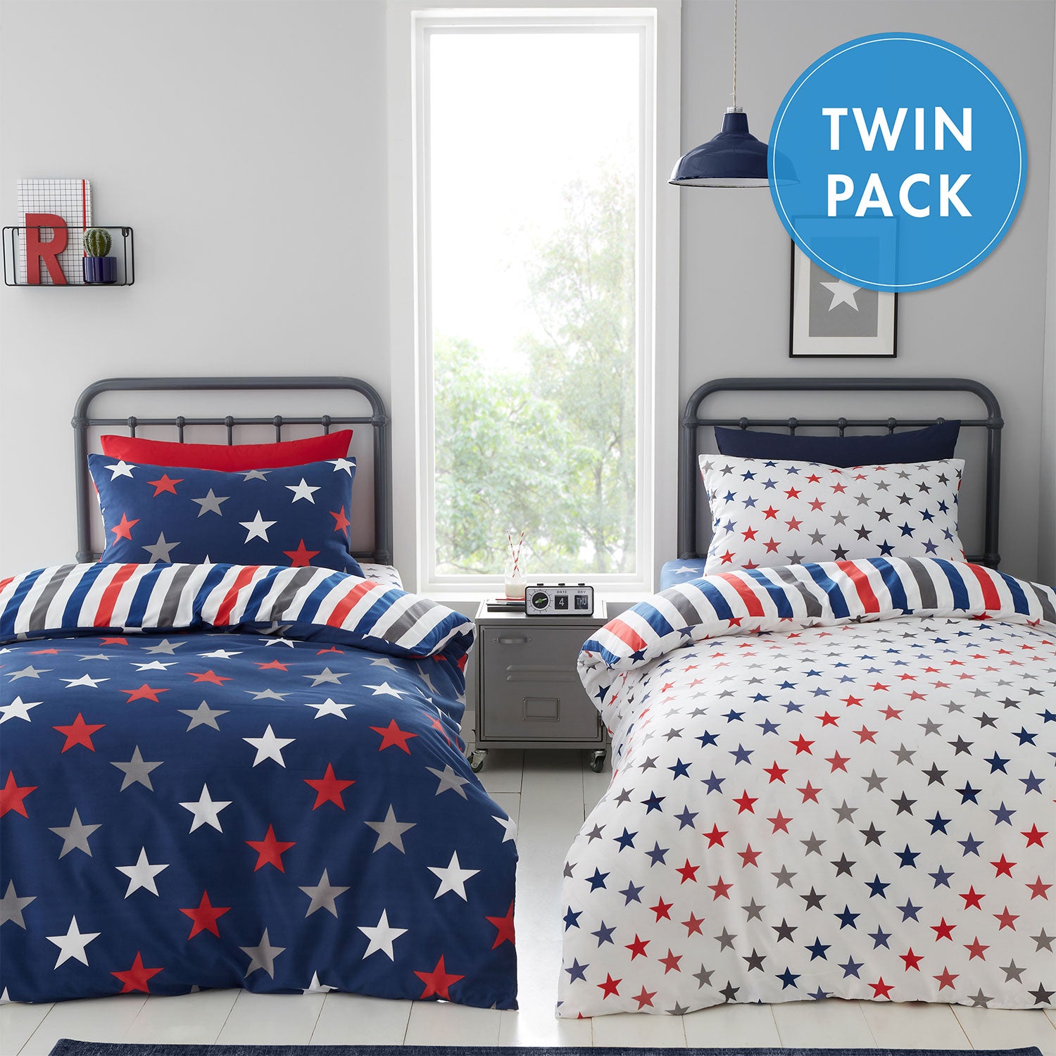 Catherine Lansfield White Blue Stripes and Stars Reversible Duvet Sets (Twin Pack)