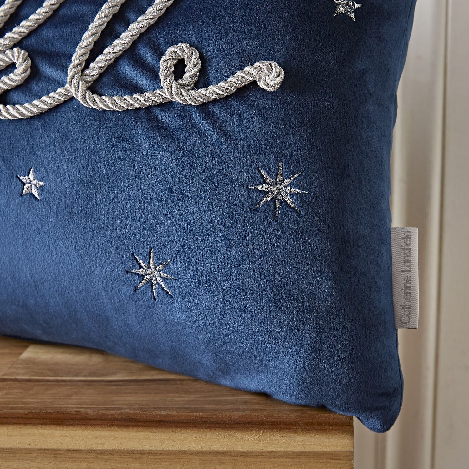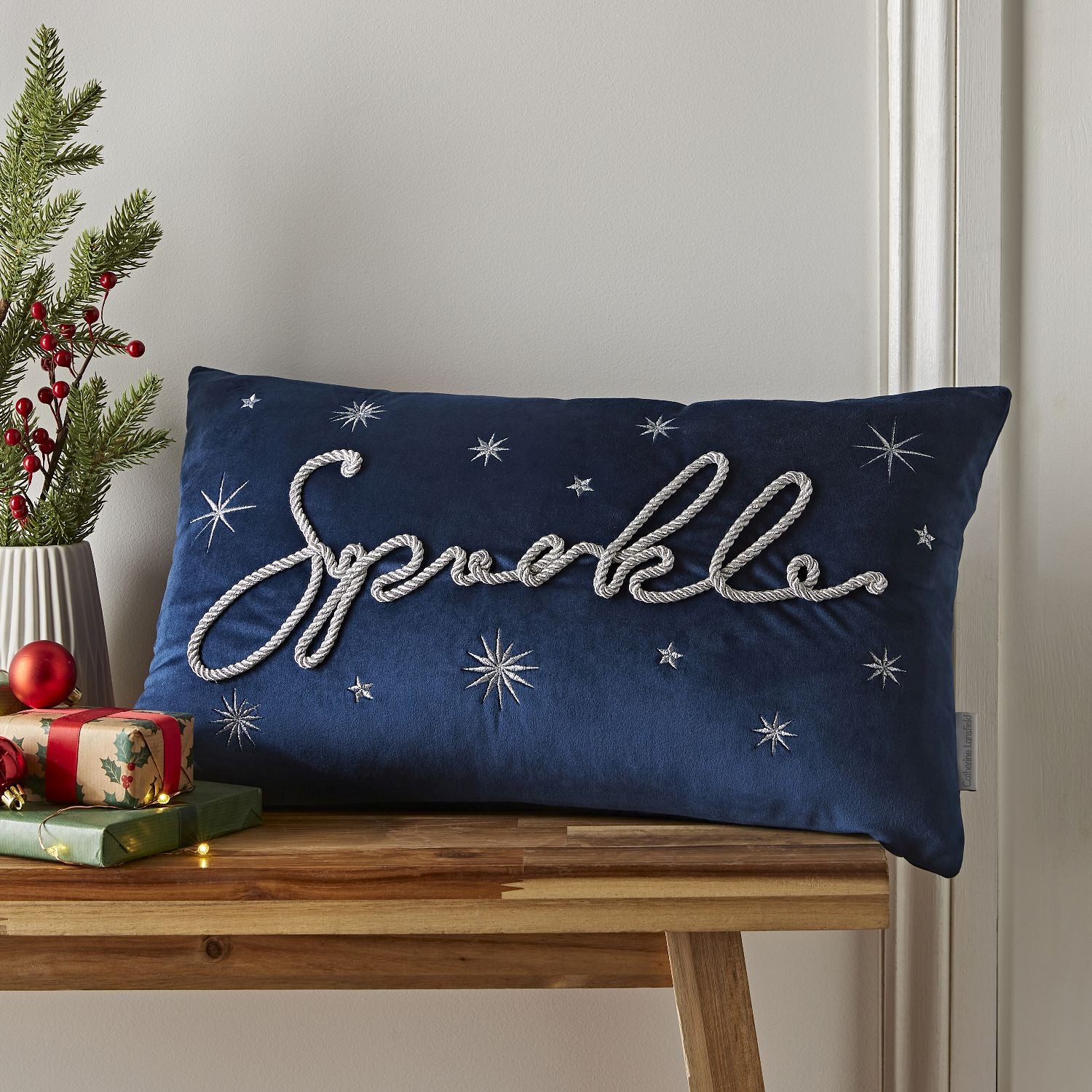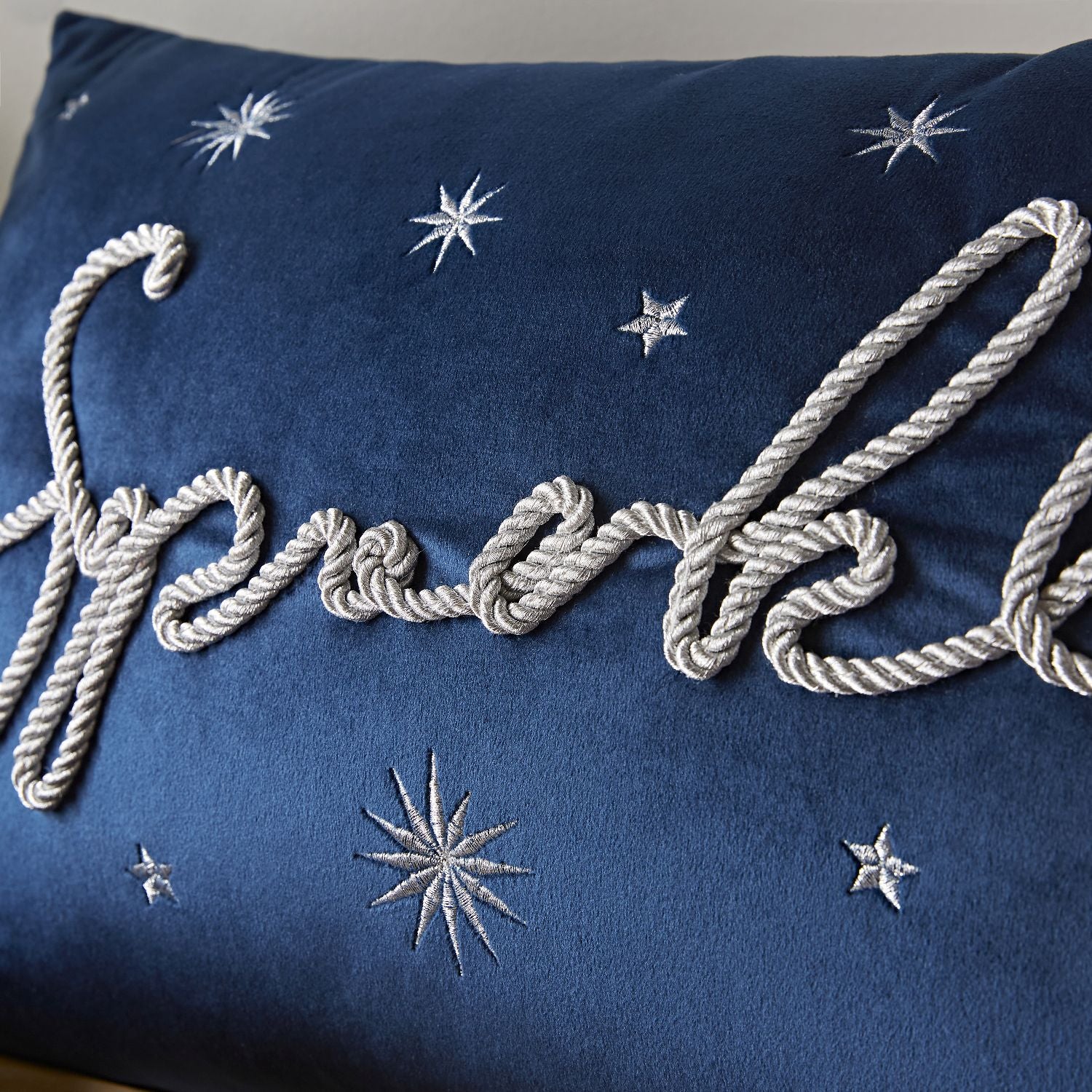 Add some glitz and glam to your holiday décor with this soft to touch velvet sparkle cushion. This stunning cushion features a deep navy base adorned with a sparkle text in a rope texture and sparkly star embroidery, adding a touch of festive elegance to any space.