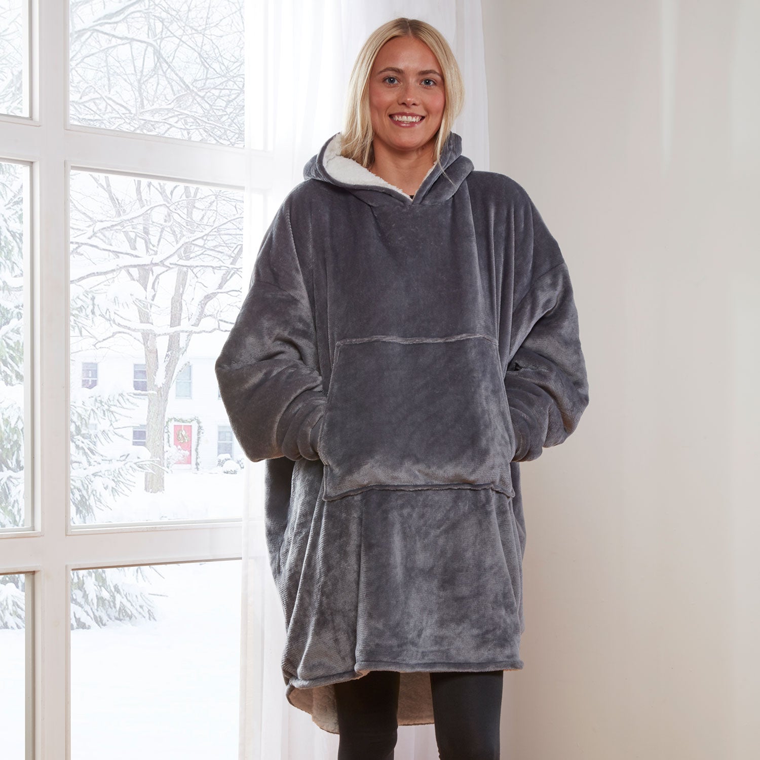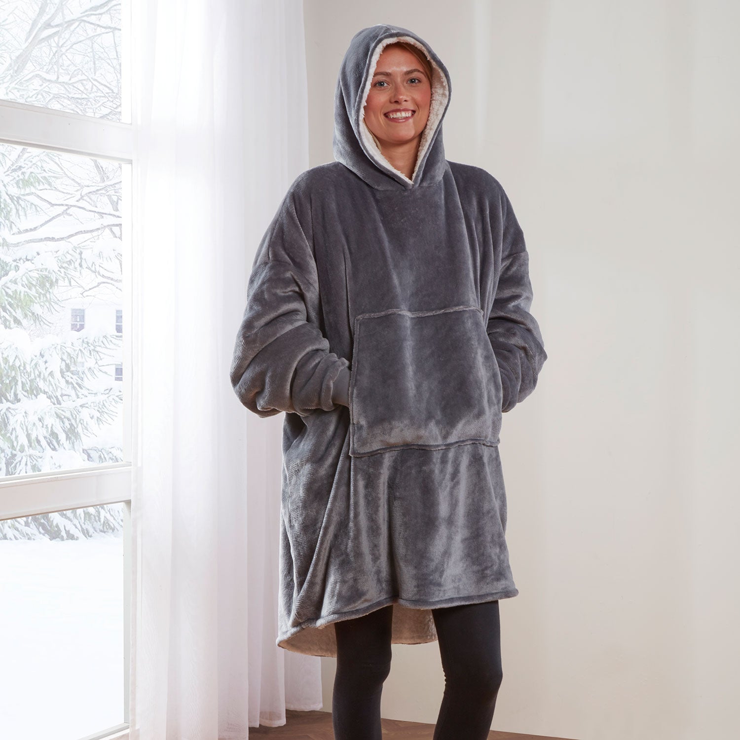Keep extra warm and cosy this winter with our cosy wearable hooded blanket. Made with supremely super soft fleece on the face and sherpa fleece lining on the reverse, this oversized hoodie is perfect for lounging on the sofa and watching films this winter.
