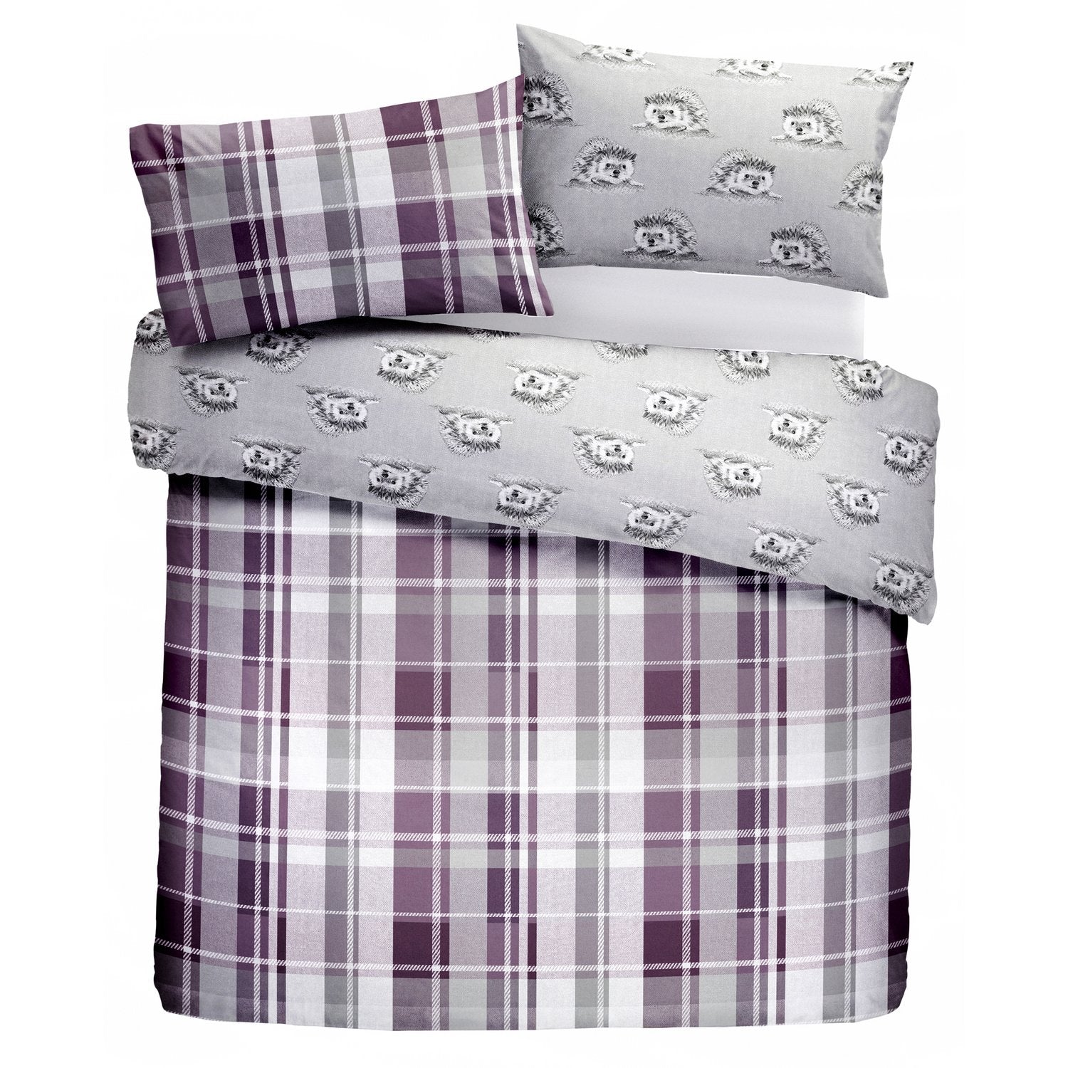 Colville Check Plum is a super-soft 100% brushed cotton bedding design with an in-style all over large purple checked pattern. The reverse of the duvet cover features a cute hedgehog repeating pattern. This duvet cover set comes with matching pillowcases.