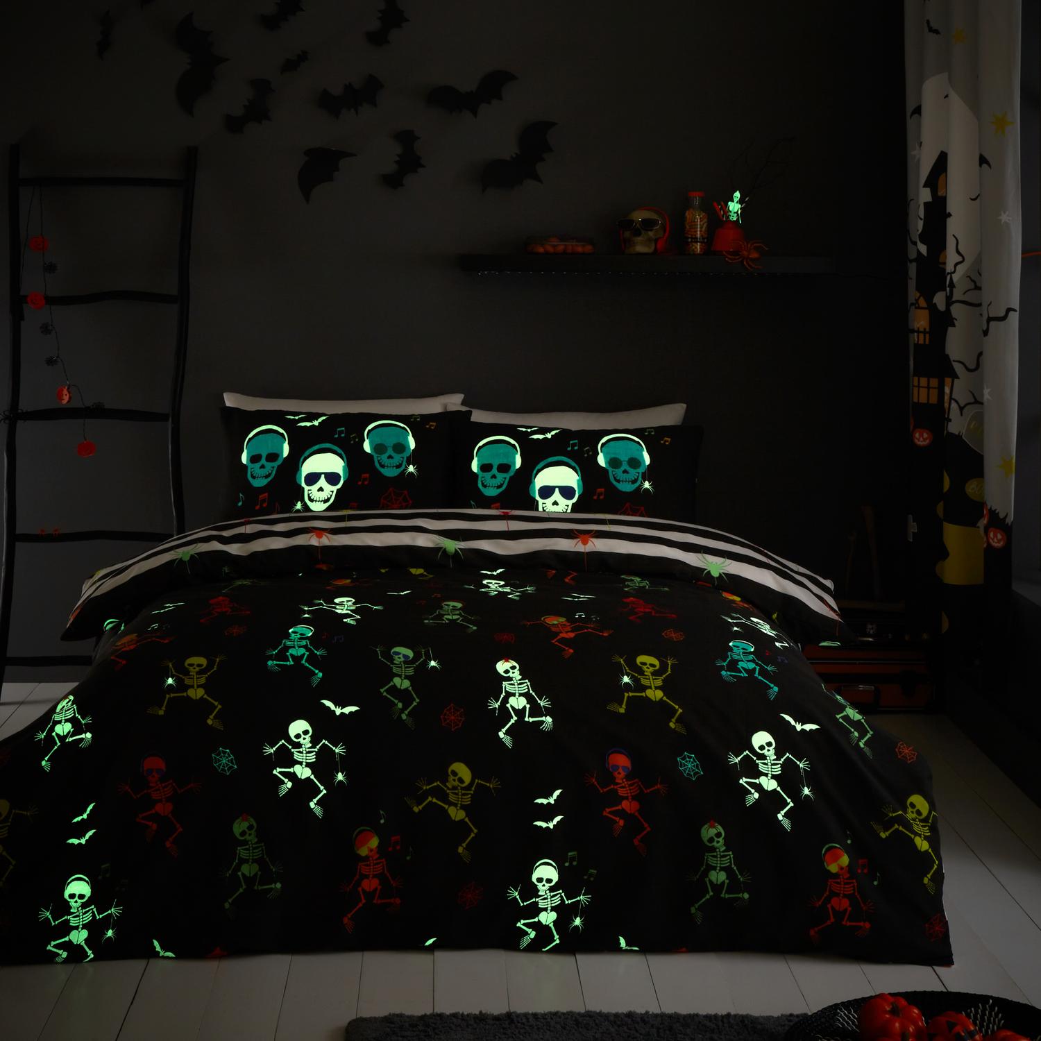 Trick or treat yourself and have a Happy Halloween with this wicked glow in the dark bedding. Printed on to an easy care poly cotton fabric, this duvet set featuring glowing dancing skeletons will ensure you have a spooktacular bedtime.