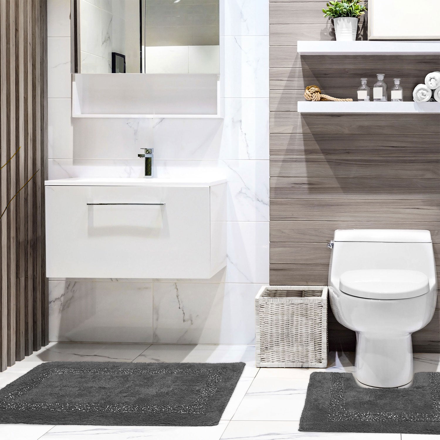 The set features a sparkling metallic silver thread border for an attractive finish. Made from soft, absorbent cotton, these mats are comfortable on the feet and keep your floors dry.