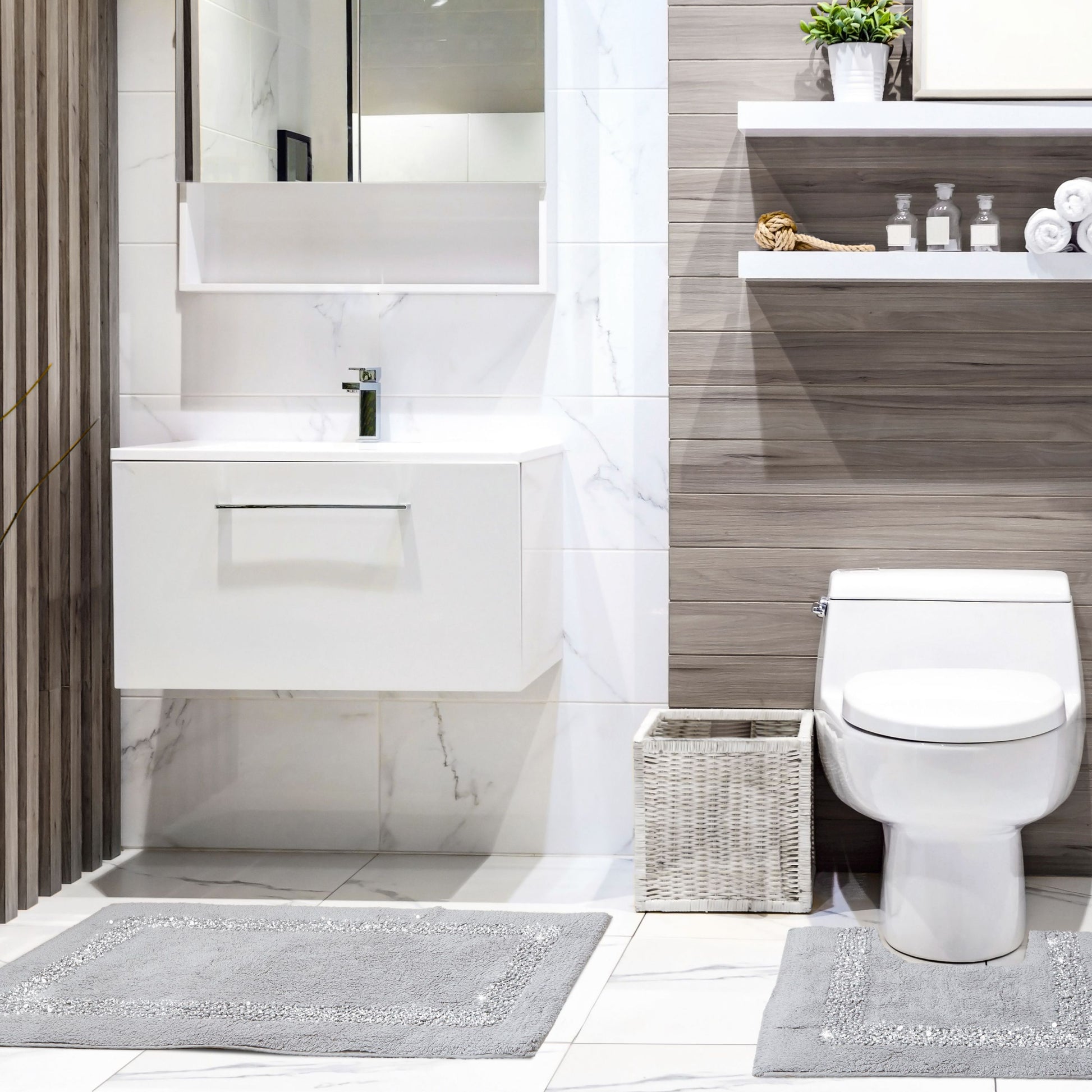Introducing the Diamante Border bathroom bathroom set. This luxurious 2-piece set includes a 50x80cm bath mat and a 50x40cm toilet pedestal mat.