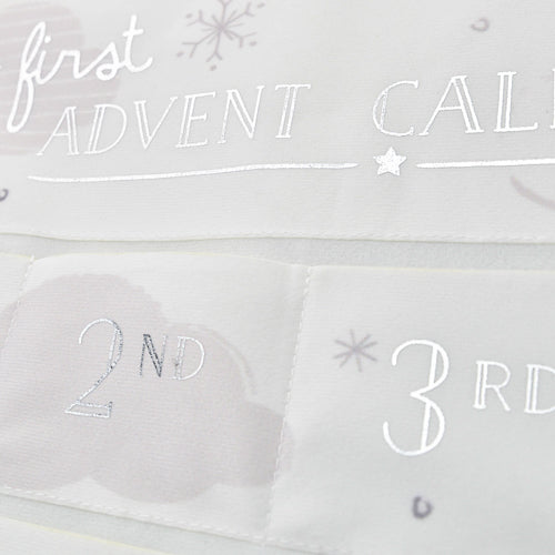 Introducing a charming Dumbo fabric advent calendar from Disney, perfect for making baby's first Christmas truly memorable. This delightful calendar from Magical Beginnings features an enchanting Dumbo design crafted from pristine white fabric. Each window offers the opportunity to fill it with special treats, while the glittery lettering of "My First Advent Calendar" adds a touch of sparkle.