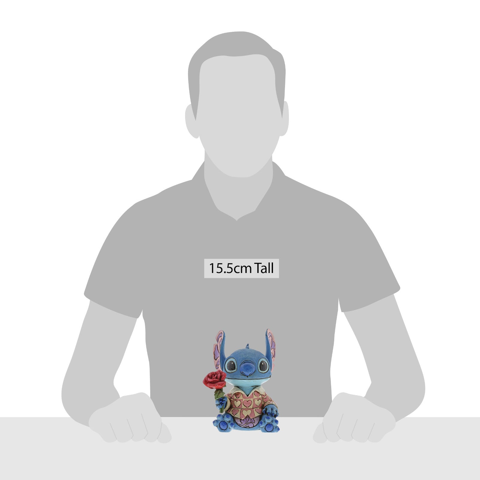 Stitch has transformed into a model citizen that Lilo would be proud of! Designed by Jim Shore, the adorable alien wears a heart-patterned shirt as he offers a single red rose.