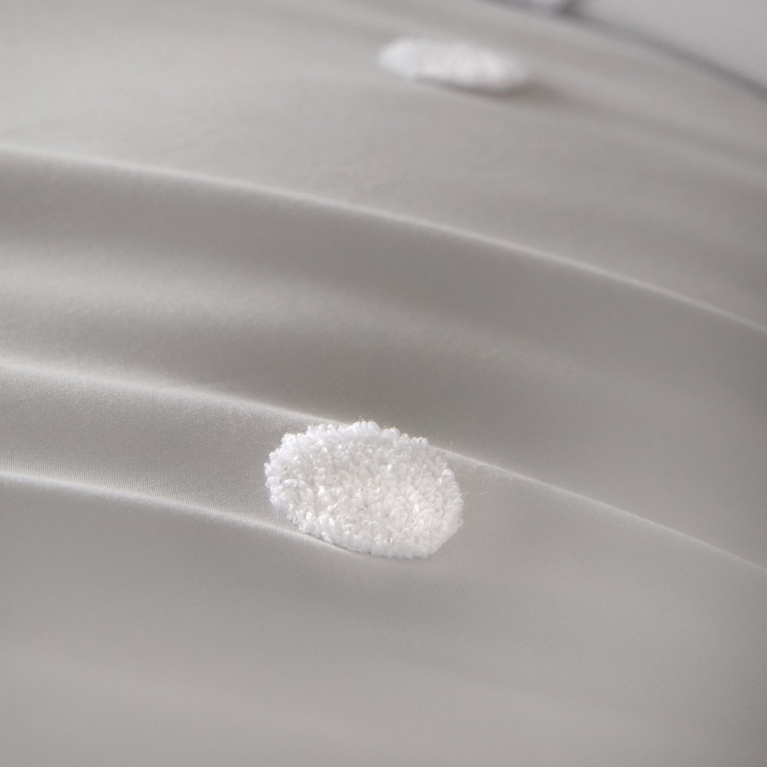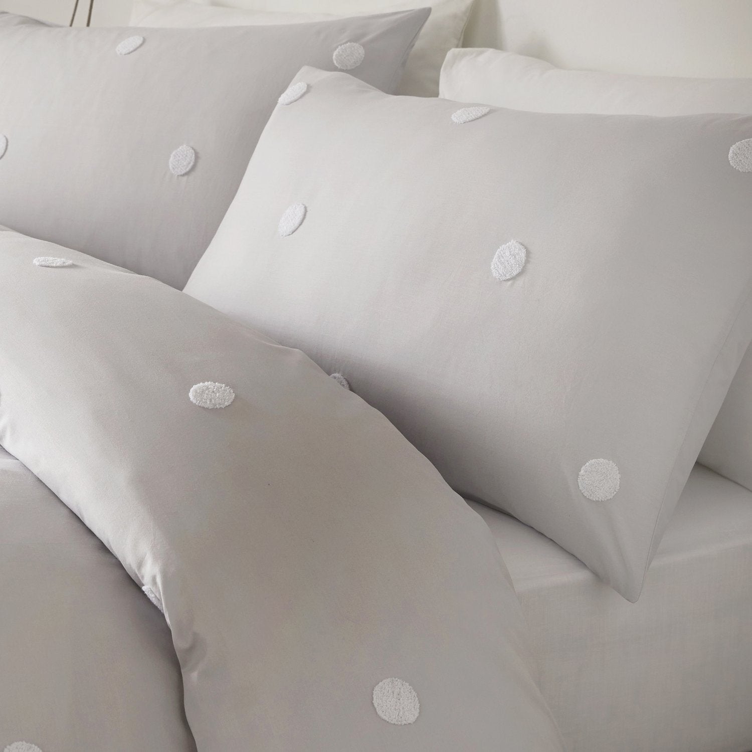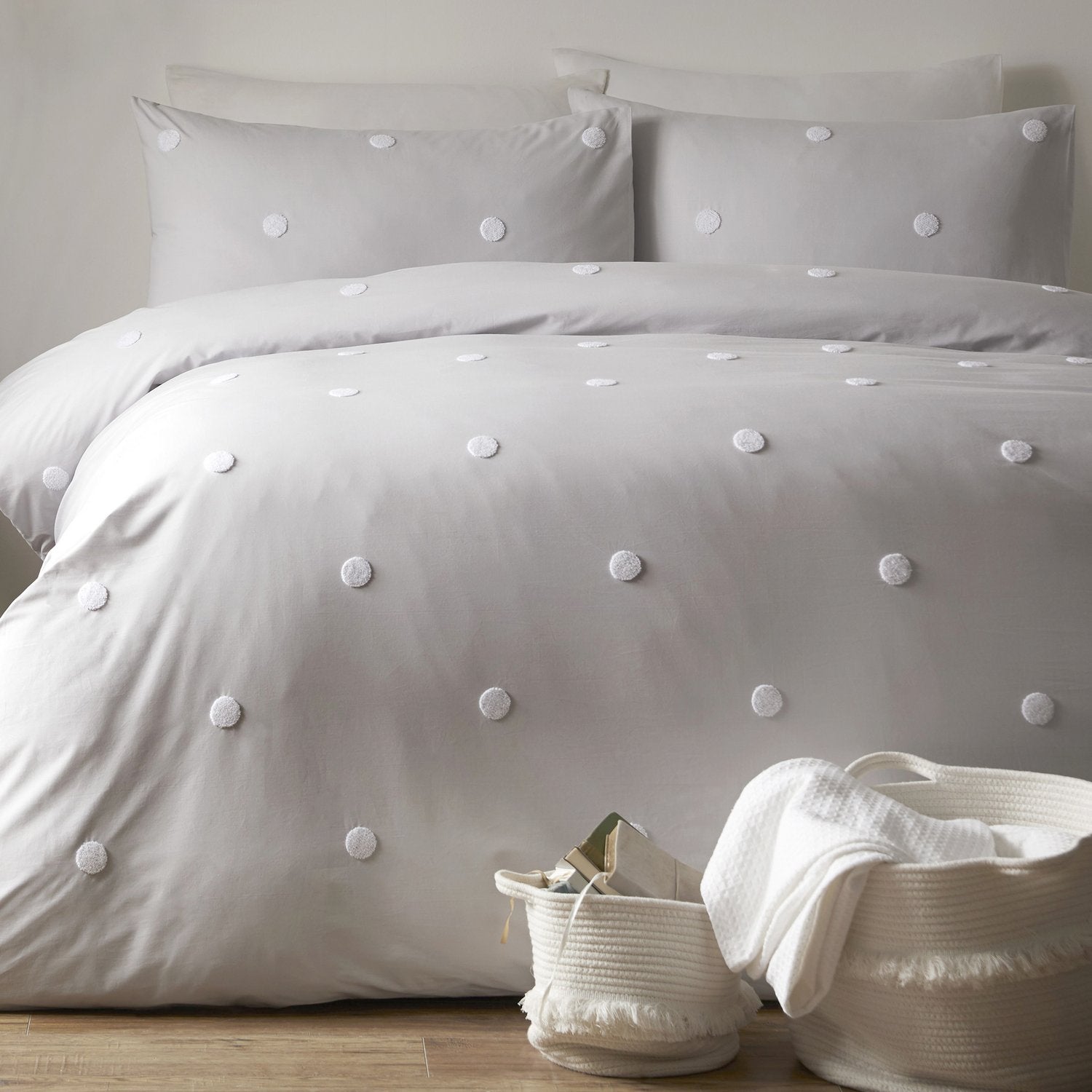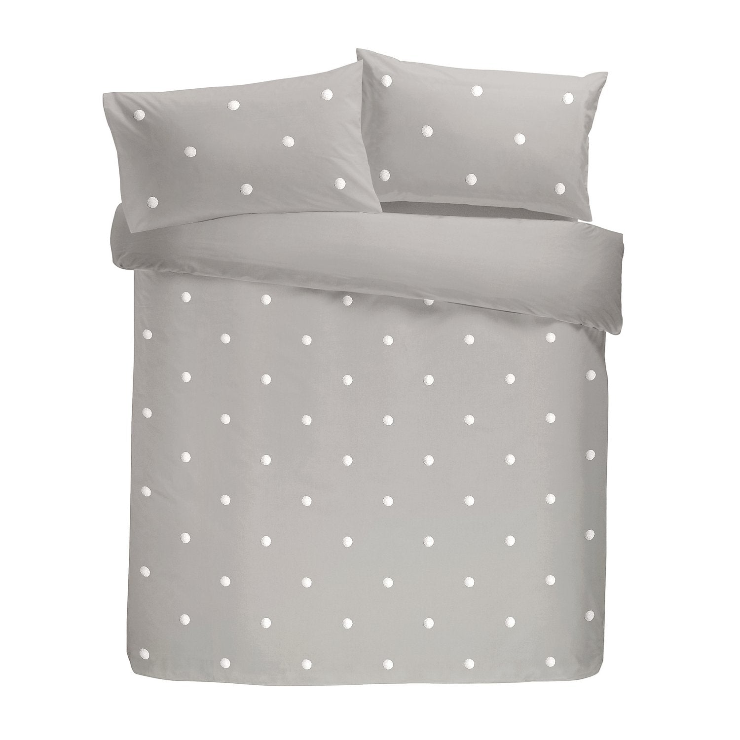 The bedding set features a white polka dot tuft on a chic silver base. Pillowcase(s) are included with the set.