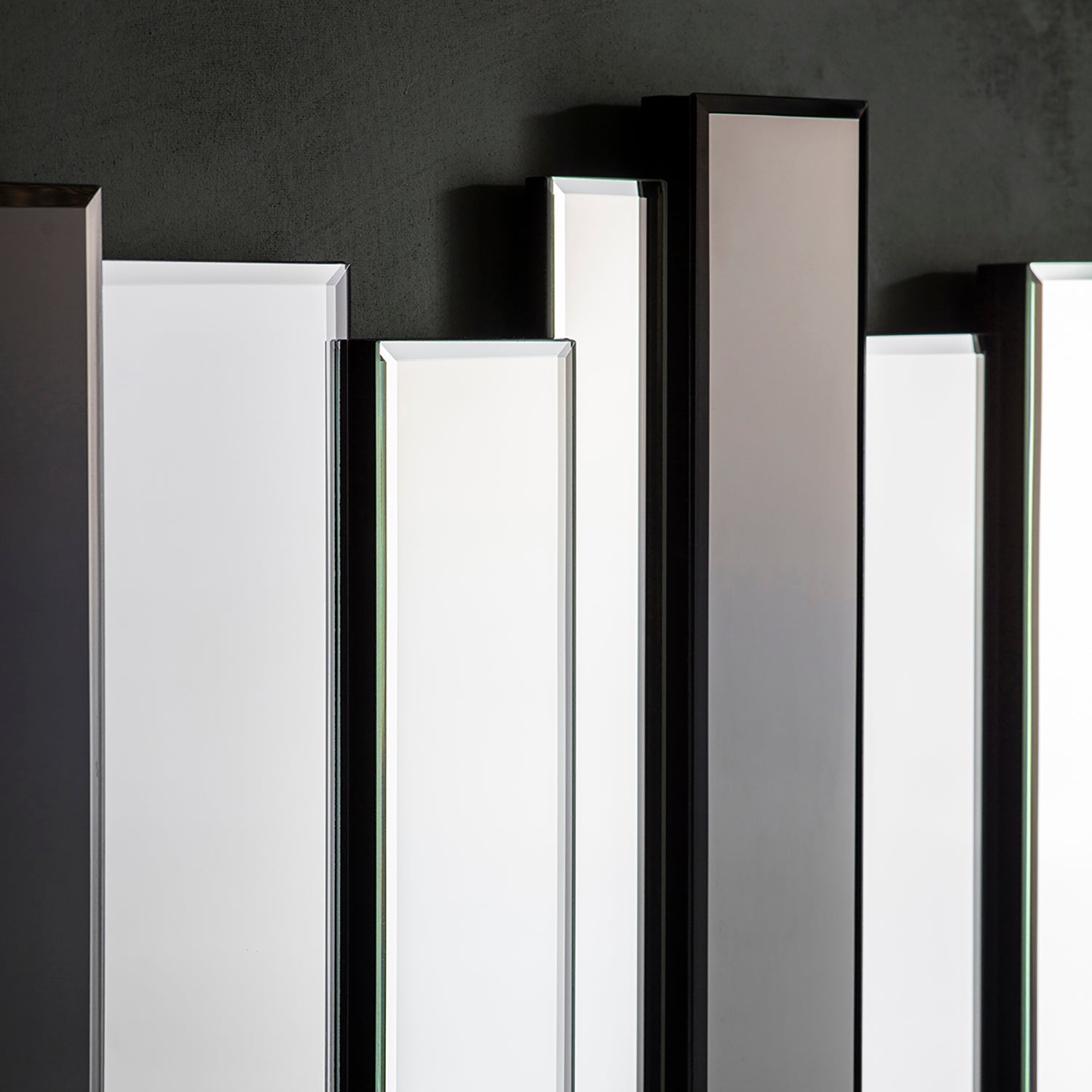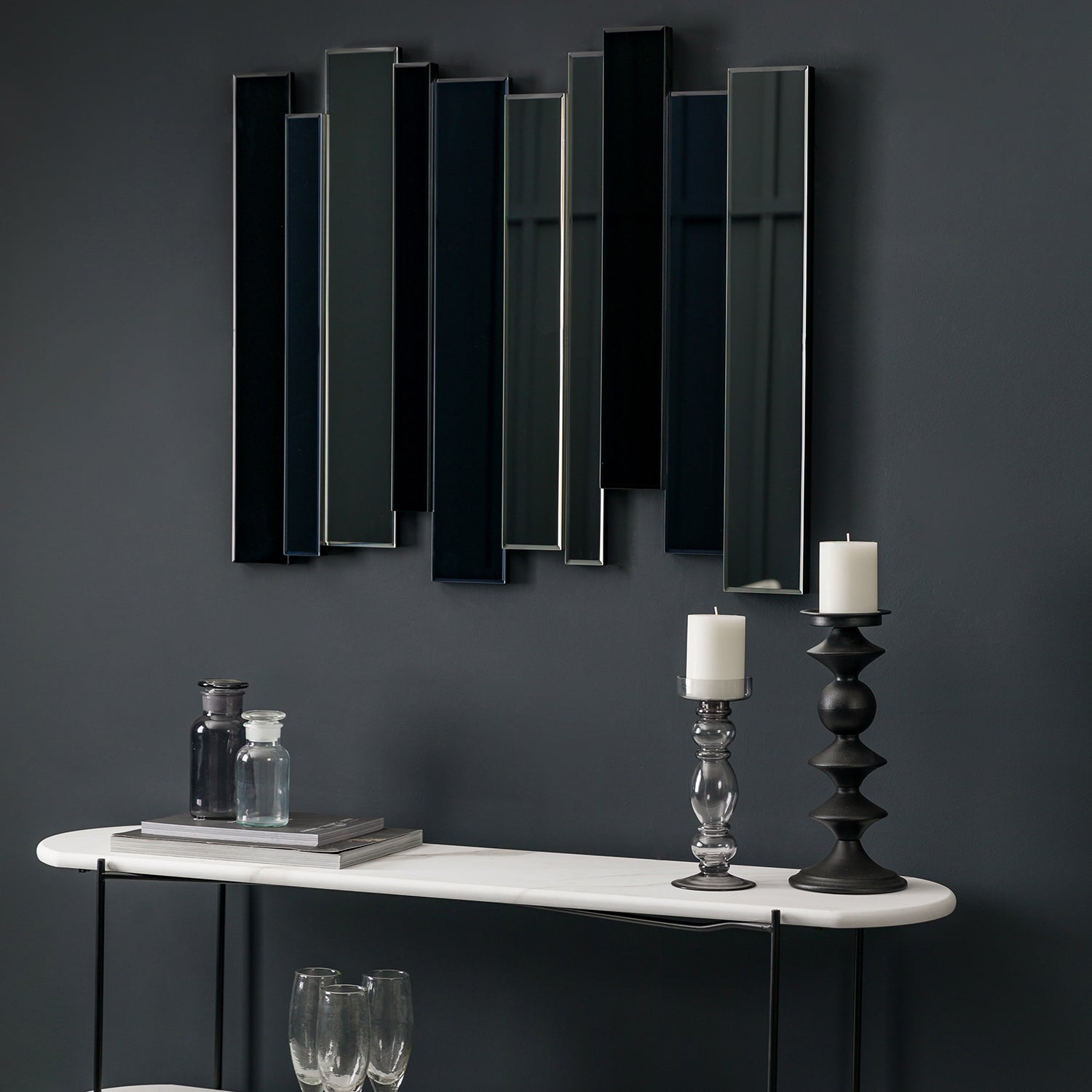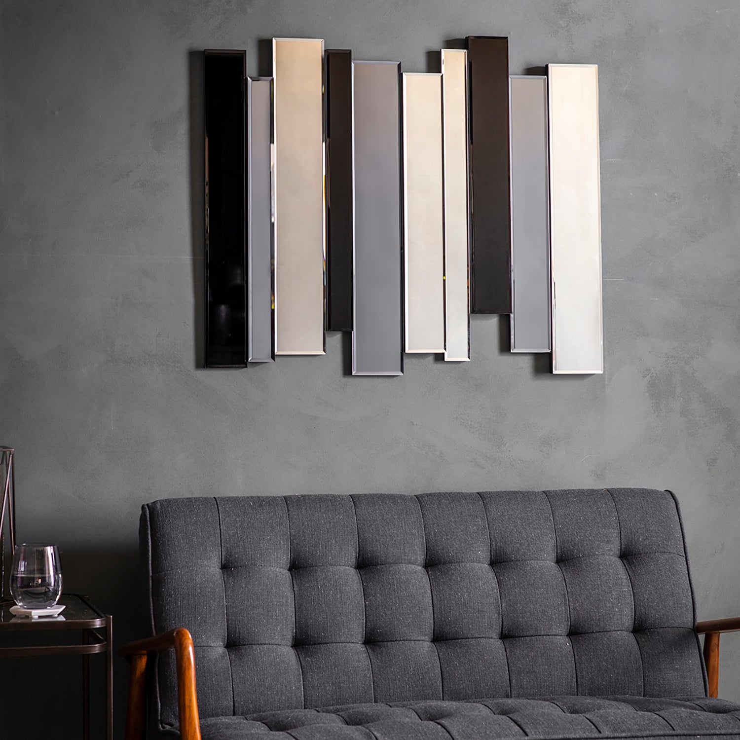 The Duval Mirror showcases a sophisticated combination of clear, smoked, and black glass, each panel carefully positioned to catch the light and reflect it in mesmerizing patterns. This piece is not just a mirror but a statement of style and elegance, perfect for adorning the walls of your home.