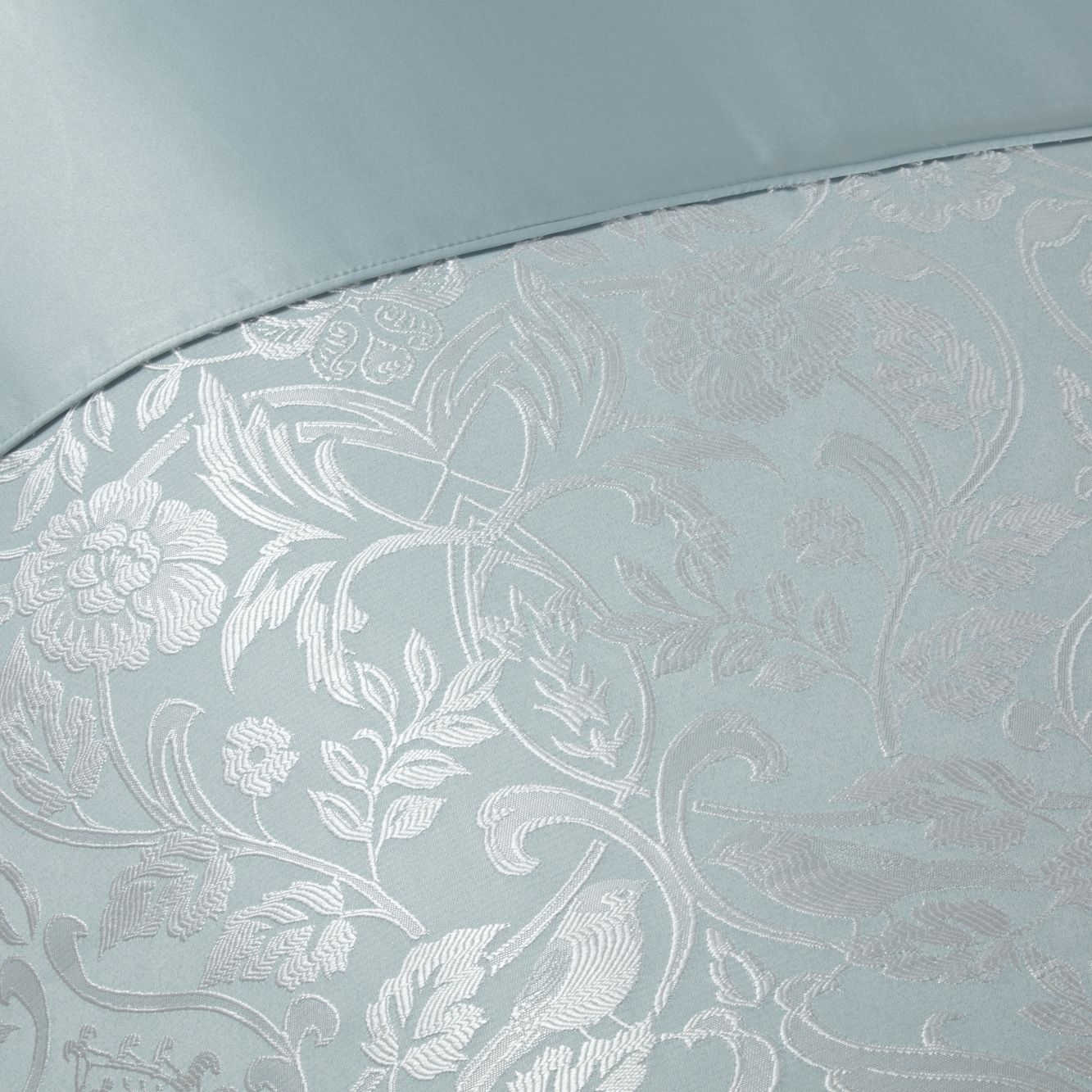 Introducing Eden Duck Egg Embellished Jacquard Duvet Set. Treat yourself to a light and whimsical floral trellis design as you slip into a luxurious experience for a wonderful night's rest.