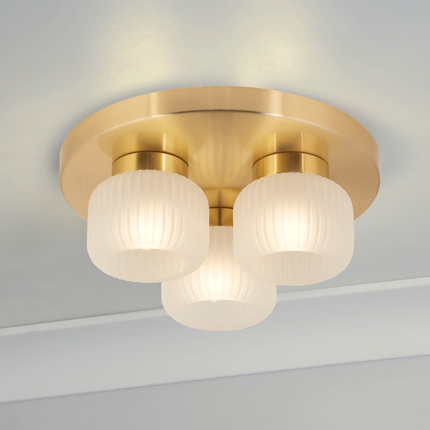 This elegant ceiling flush light fixture with brushed brass finish and white ribbed glass shades is ideal for modern interiors.
