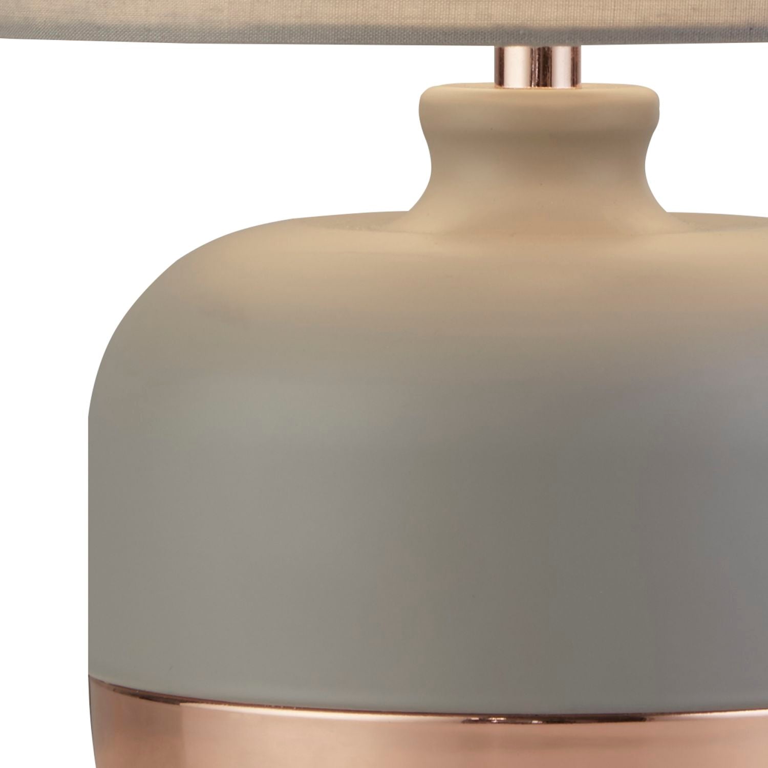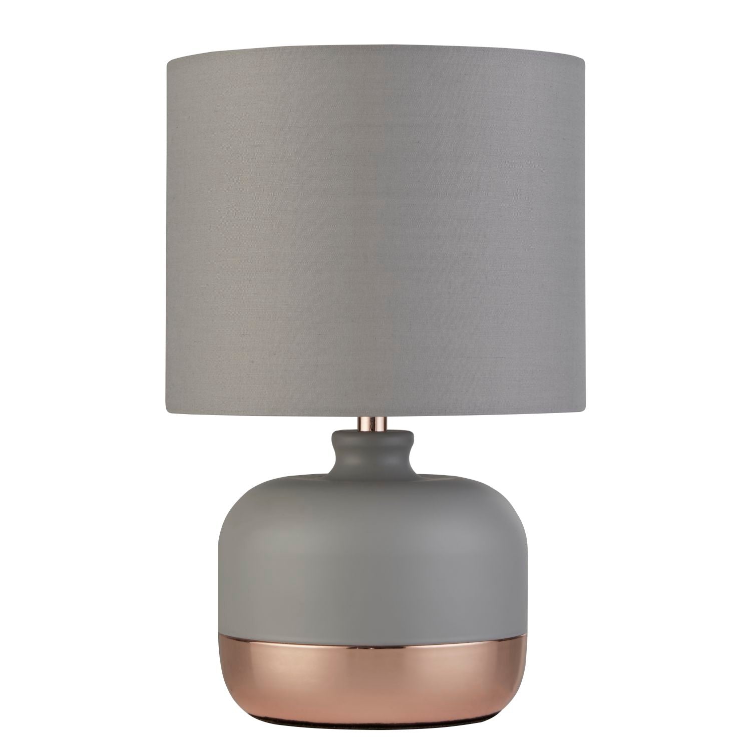 Featuring a sleek grey and copper base and a matching grey shade, this lamp is sure to become the centrepiece of any room it inhabits. Whether you're looking to brighten up a cosy reading nook or simply add a warm ambiance to your living space, this lamp is the perfect choice.