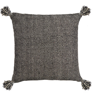 This cushion showcases a contemporary two-tone woven herringbone pattern, elegantly accented with tasselled corners. Crafted from 100% recycled cotton fibres, it is an eco-friendly choice.