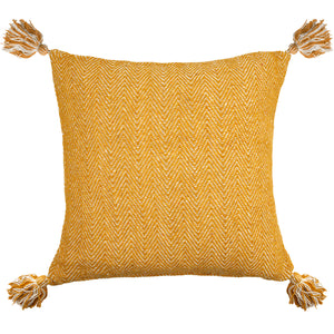 This cushion showcases a contemporary two-tone woven herringbone pattern, elegantly accented with tasselled corners. Crafted from 100% recycled cotton fibres, it is an eco-friendly choice.