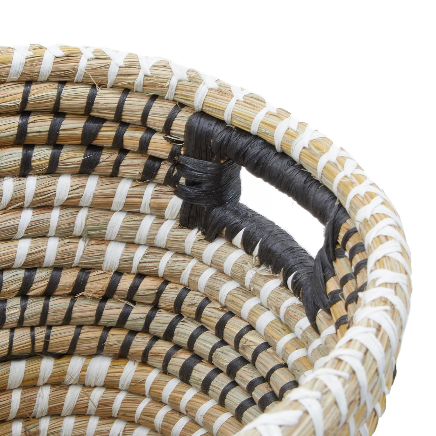 This set of three handwoven baskets features an oval design with raised sides. Each basket in natural hues accentuates black and white twisted seagreass detail that gently rolls around the tubular design. Cutout side handles bring easy hold and portability.
