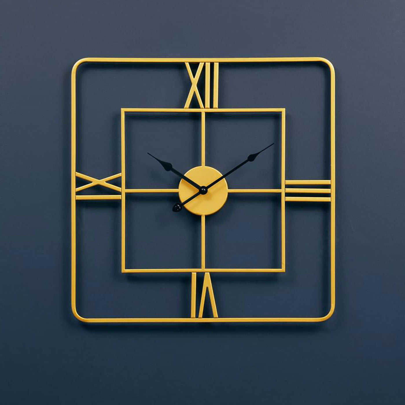 This small wall clock has a sleek double framed square metal design in a luxurious gold finish. The design comes complete with Roman numerals and black spade hands which contribute to a modern minimalist aesthetic.