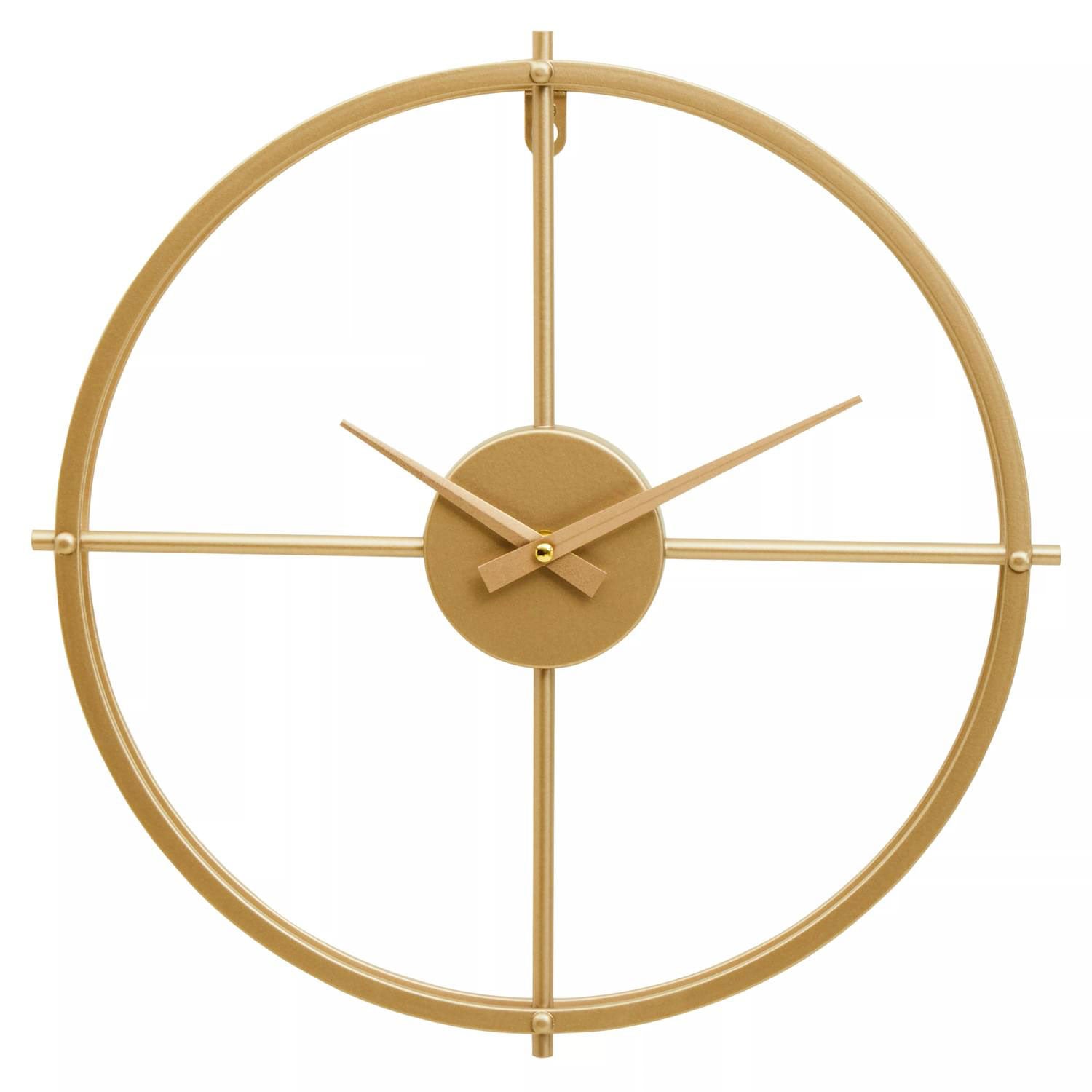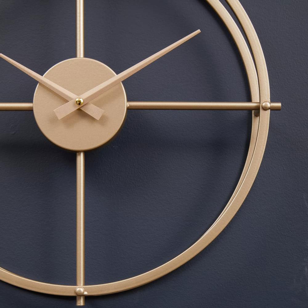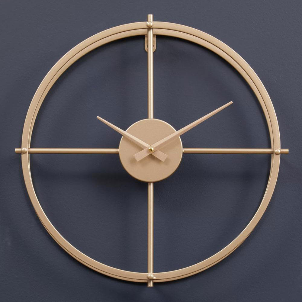 Crafted from metal in a gold finish, this small wall clock has a modern and minimalist design with two smooth rings forming its frame. Clean intersecting lines join in the middle to support the dial and slender hands.