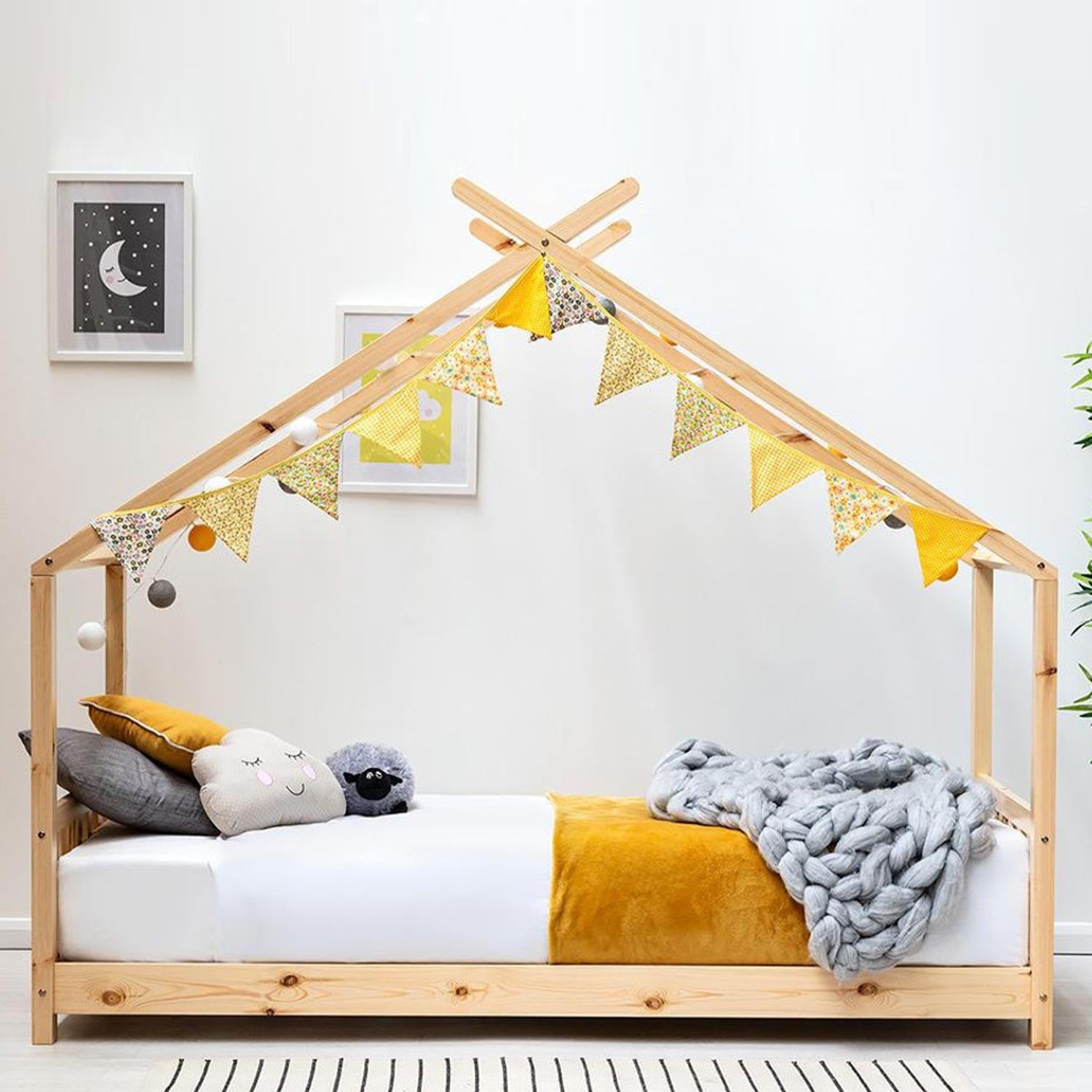 Key Features: Fun house canopy design – perfect for customising with lights, bunting & décor Solid pine wood frame for strength and durability Low-to-the-ground design – ideal and safe for toddlers moving to their first bed Creates a sleeping space, play area, and reading nook in one Fits a UK single mattress (3ft) Complete with solid wooden slats Supplied flat-packed for easy self-assembly