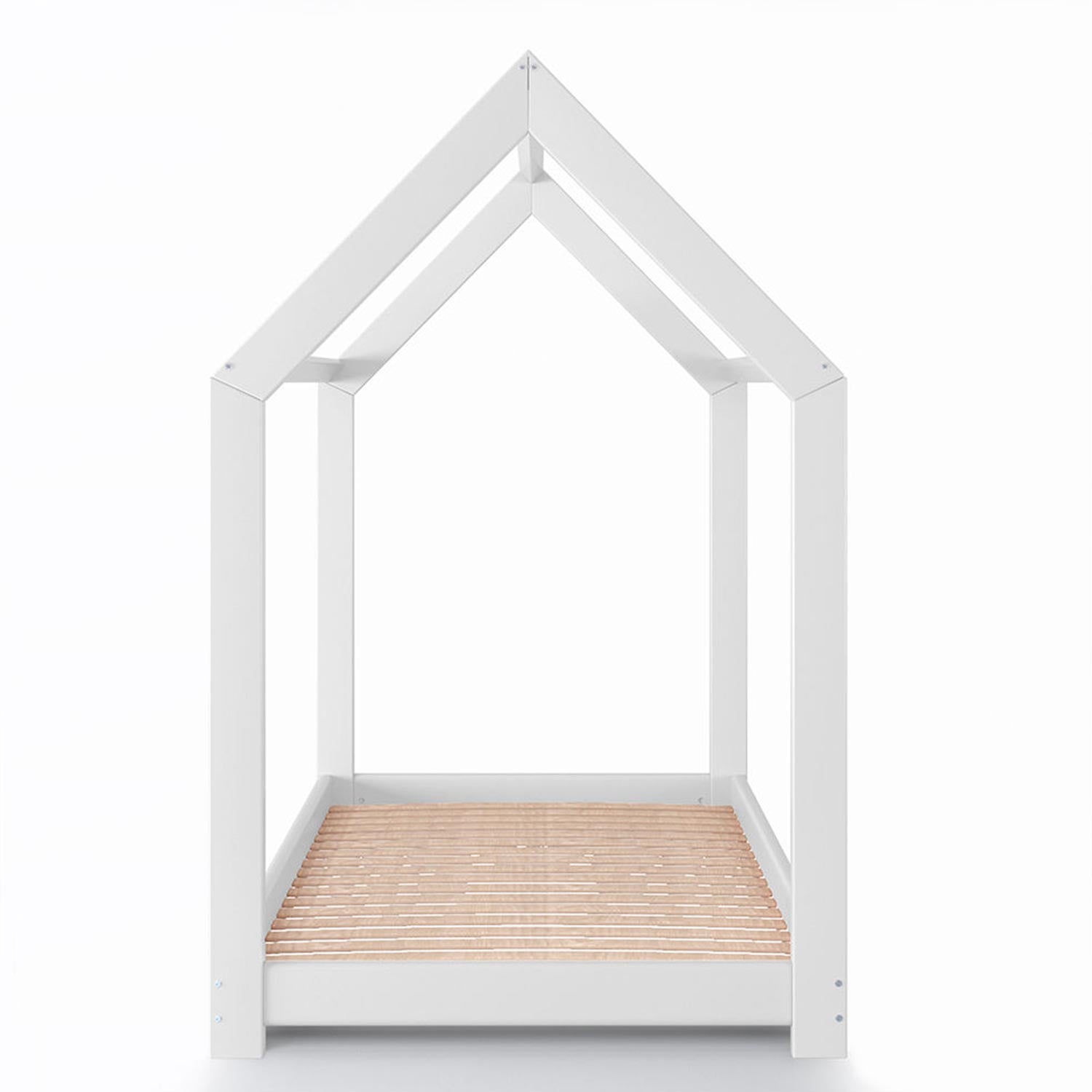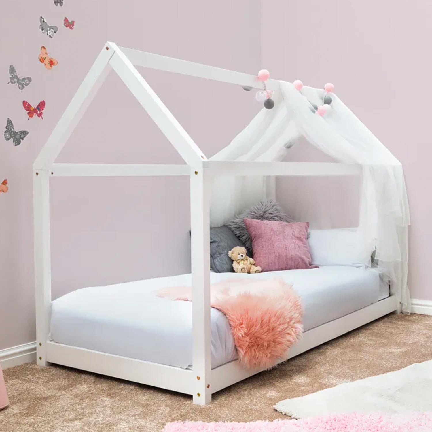 Crafted from solid pine wood with sturdy wooden slats, the frame sits low to the ground for added safety and easy access – giving parents peace of mind while encouraging independence. Its versatile house-shaped canopy creates endless opportunities for fun: drape fairy lights, hang bunting, add fabric, or even attach toys to make it unique to your child’s personality.