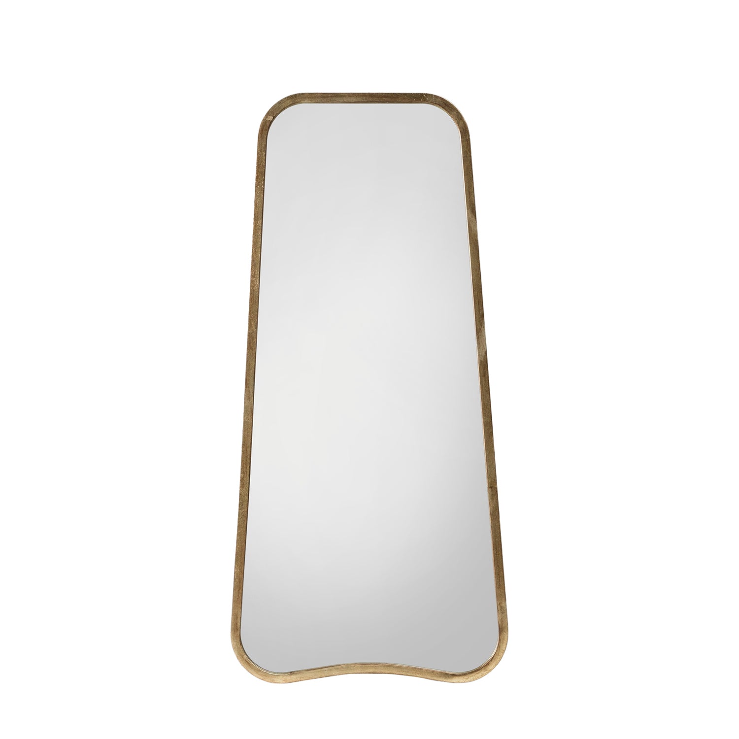 Introducing the Kurva Gold Leaner Mirror. This sleek and understated mirror showcases a stylish design with flowing curved corners and refined metal frame. Elevate your space with this elegant addition.