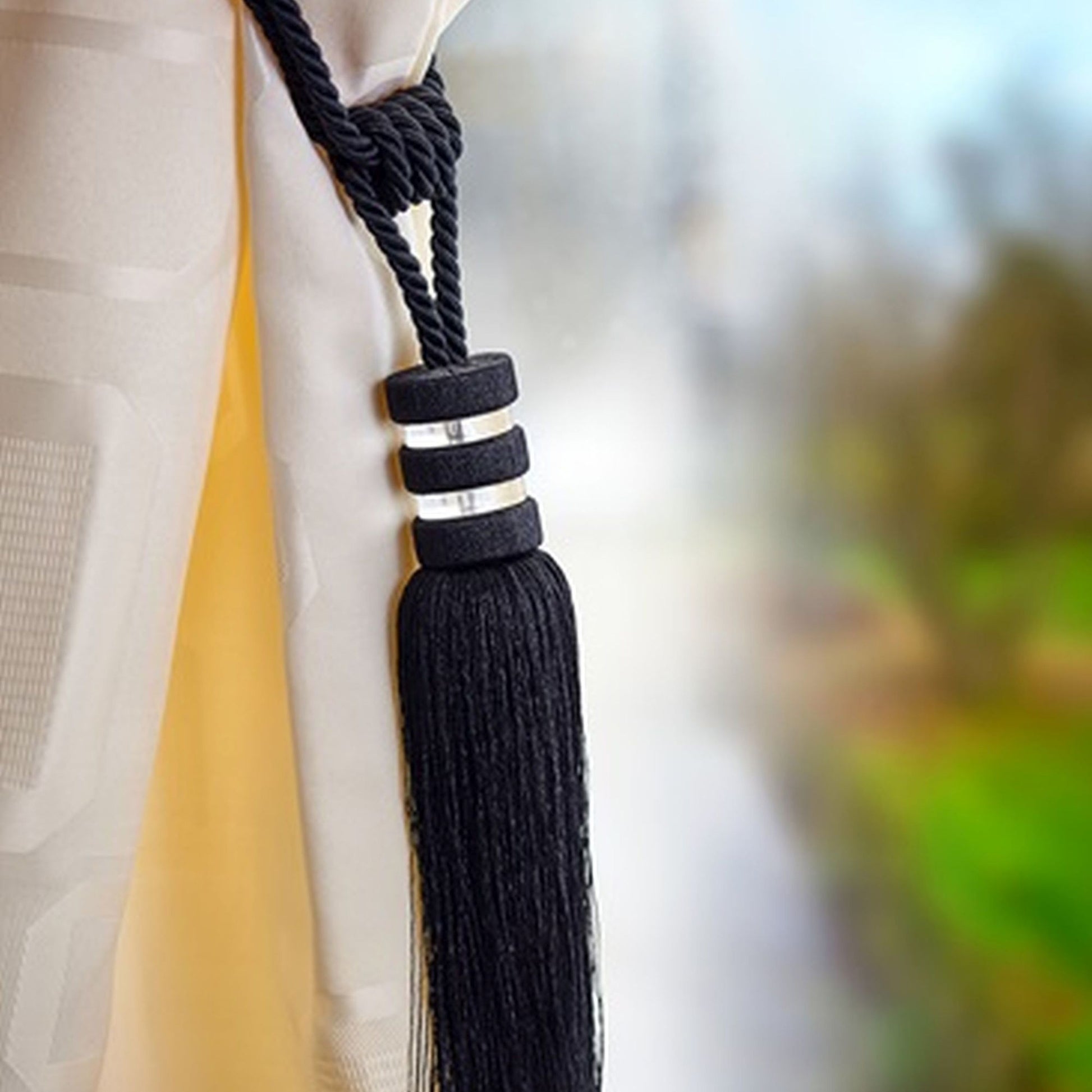 Elevate your curtains with our premium tasselled tieback featuring metallic detailing on a wooden core. This rope tieback adds a touch of luxury and sophistication to any room, making it the perfect finishing accent for your curtains.