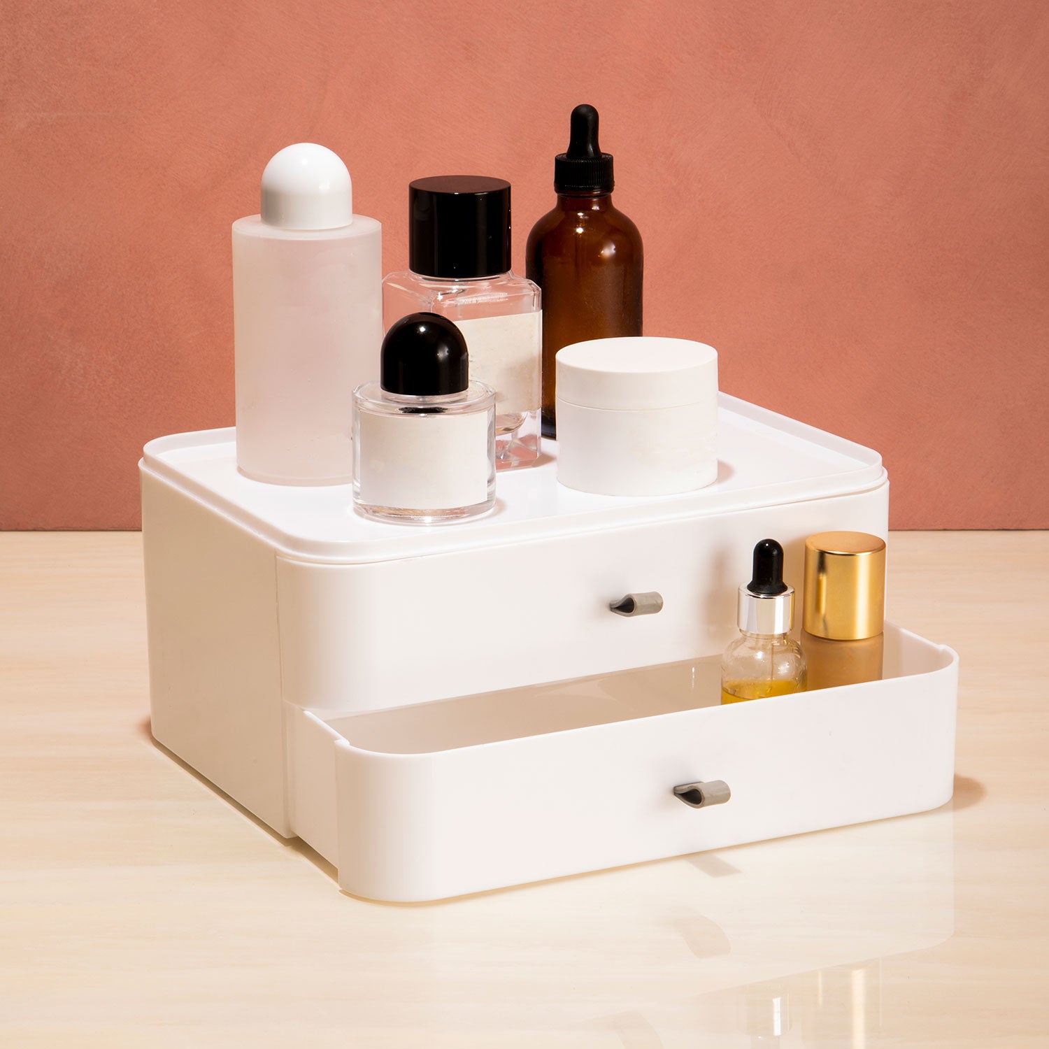Exhibiting a chic design in a white and grey finish, this cosmetics organiser has two pull-out drawers that provide ample storage space. Made from plastic, the top of this organiser has raised edges to display accessories appropriately.