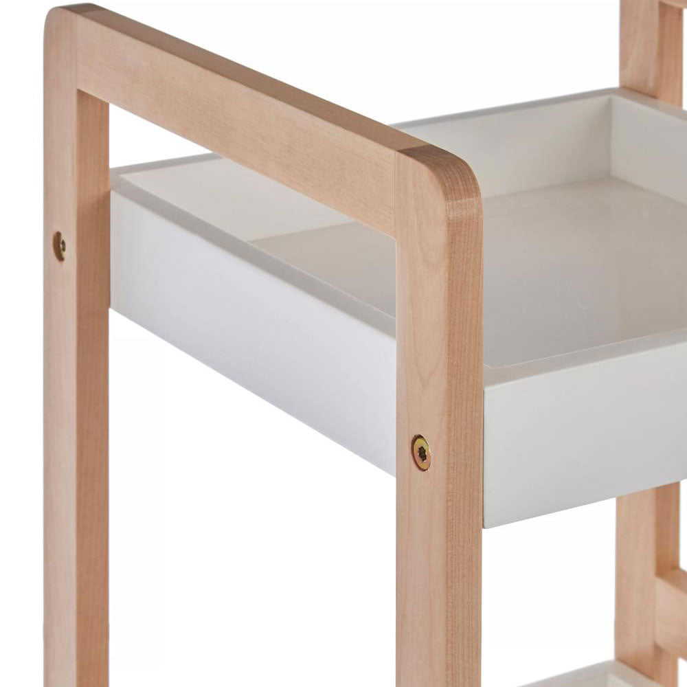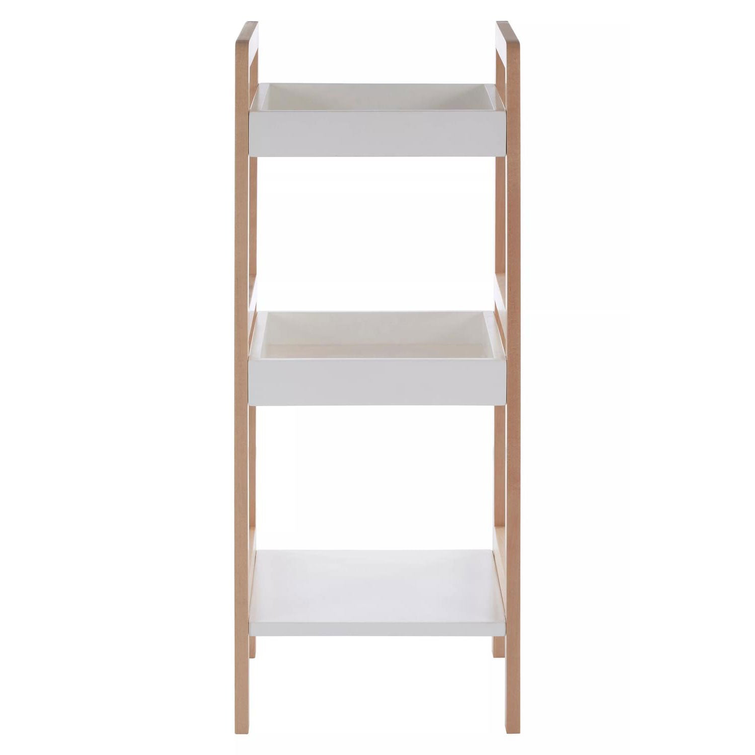 This bathroom shelf unit features a minimalist Birchwood frame. It has three shelves, with the top two having raised edges for secure placement of items. The shelves are made from MDF which gives them strength and durability.