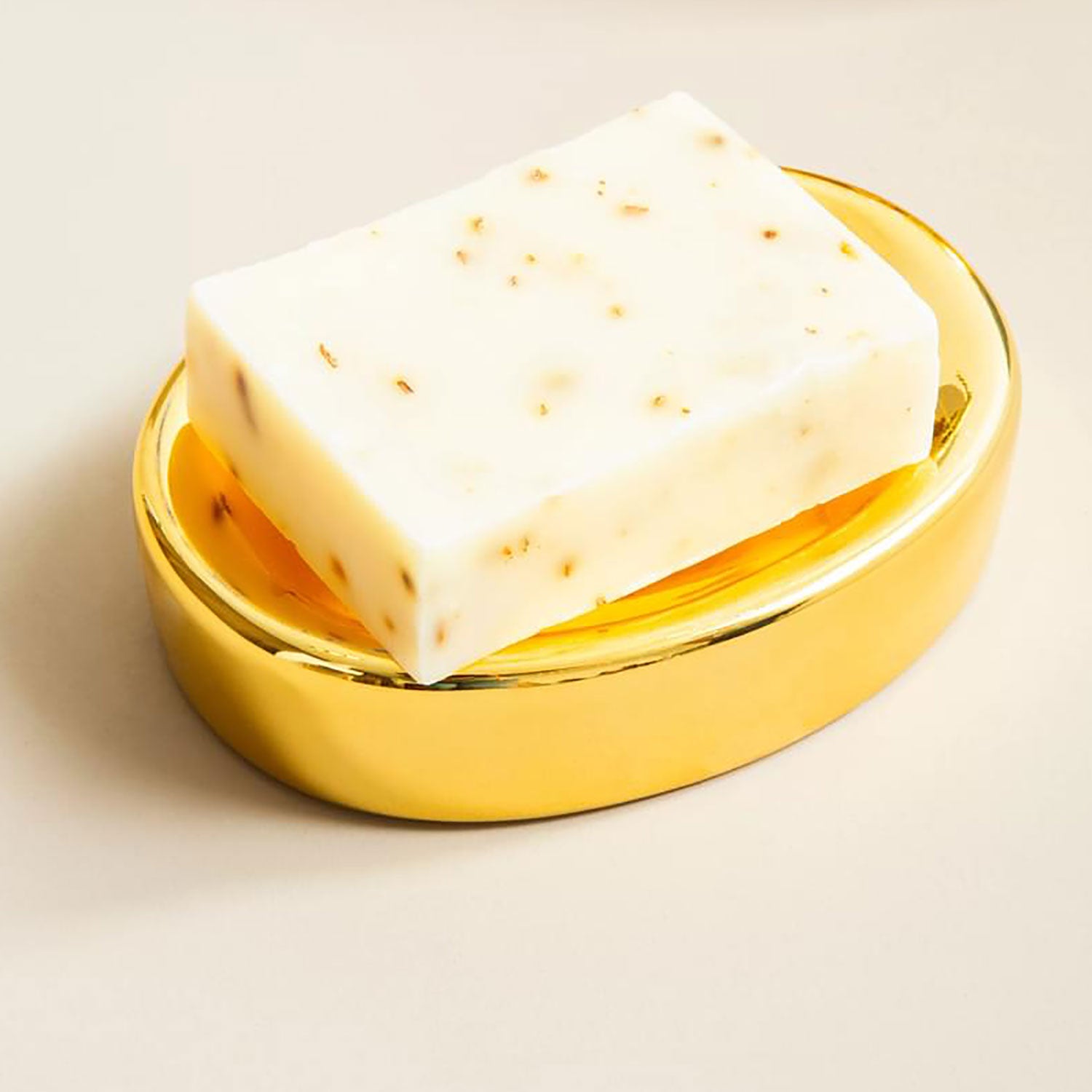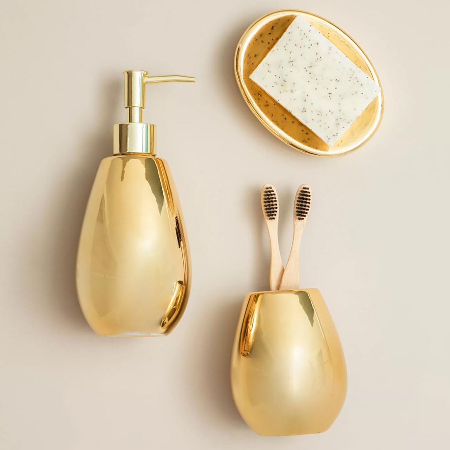 The beautifully designed set includes a lotion dispenser, soap dish and tumbler. Each piece is made from durable ceramic and features a smooth curved design which is further accentuated by an elegant gold finish.