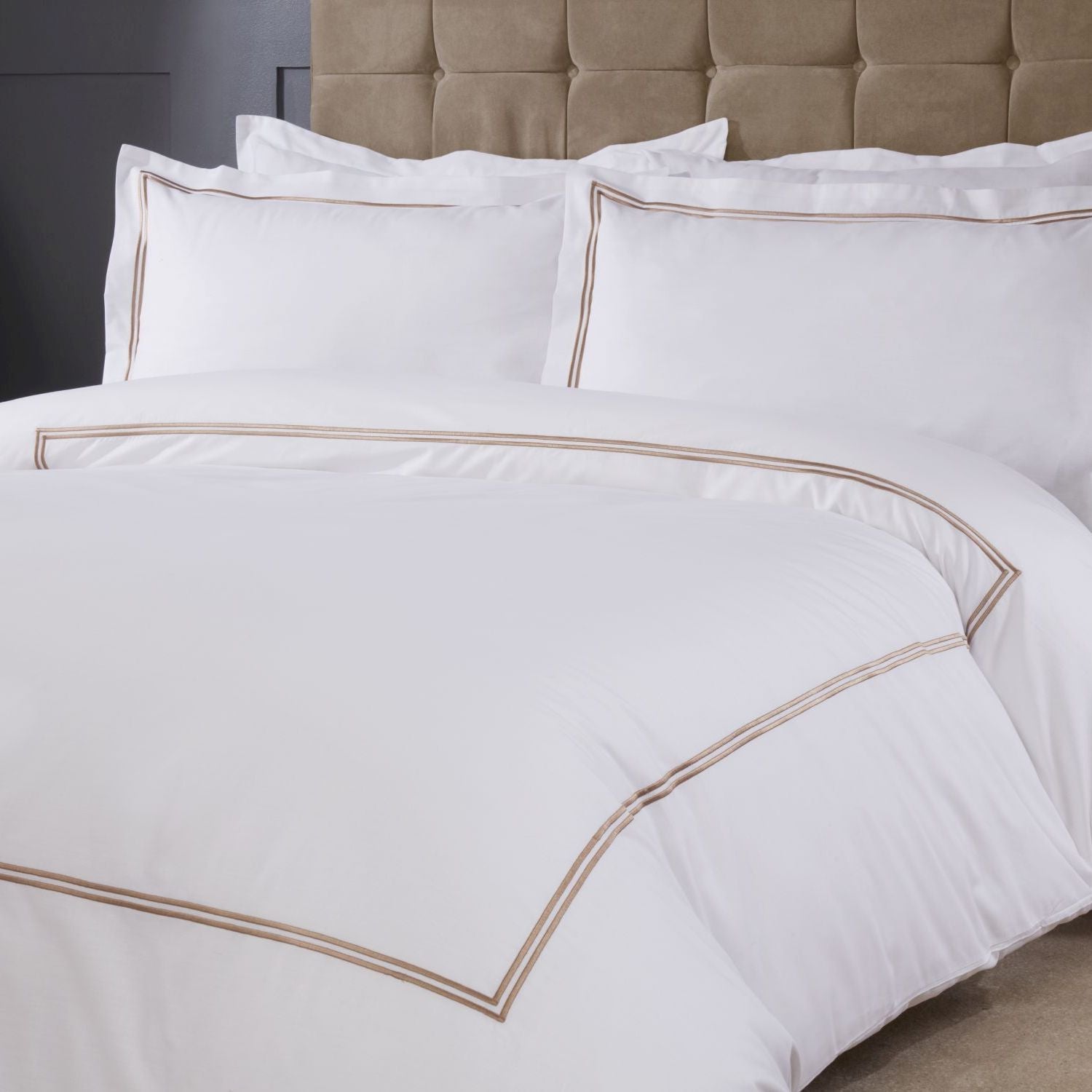 Create a cosy and stylish bedroom sanctuary with our Mayfair Taupe Embroidered Duvet Set! This timeless White and Taupe colour combination brings sophistication to your bedding.